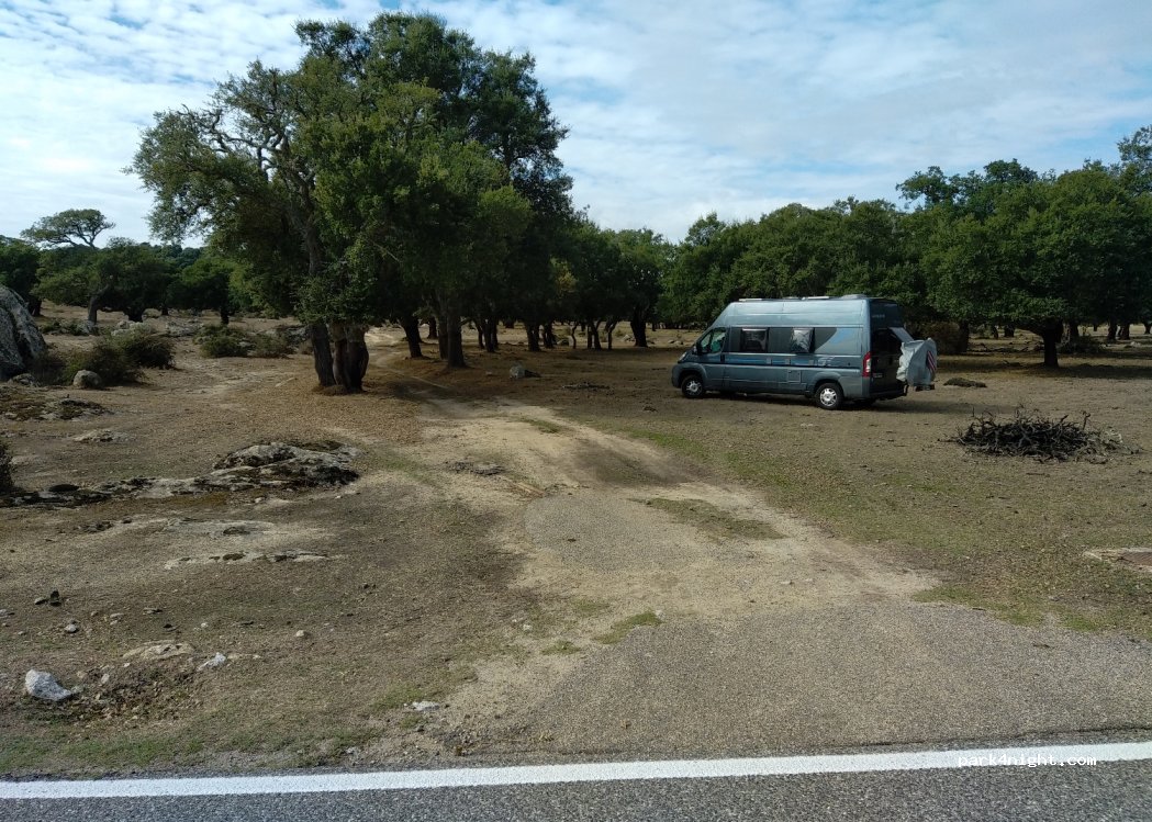 Au niveau du col, immense zone plate de forêt de chênes liège assez clairsemés. il y a plusieurs possibilités soit vous restez devant pour déjeuner la route est peu passante à cette époque de l'année,soit vous prenez la piste sur votre gauche pour aller un peu plus loin.