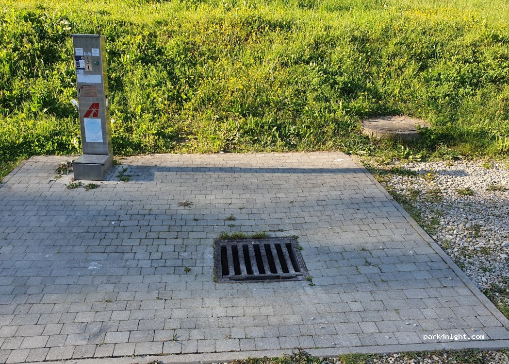 Auch für XXL Camper geeignet. Bodeneinlass mit viel Platz zum Rangieren. Frischwasser ca. 80 l für 1 €