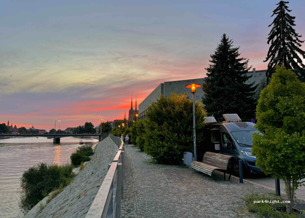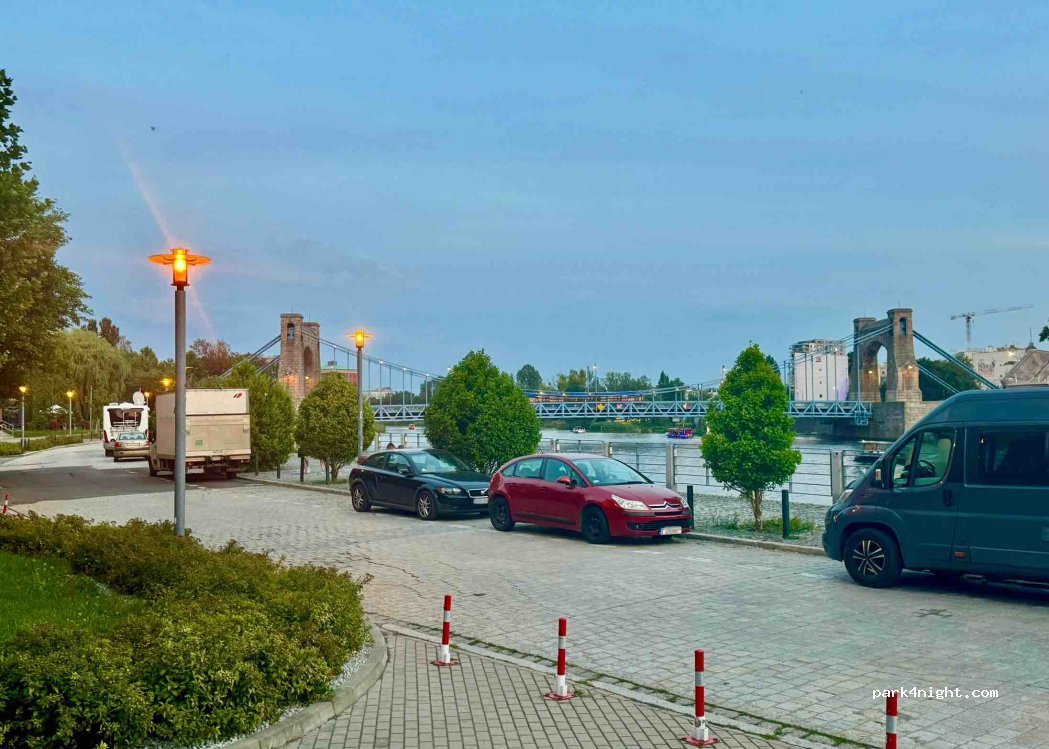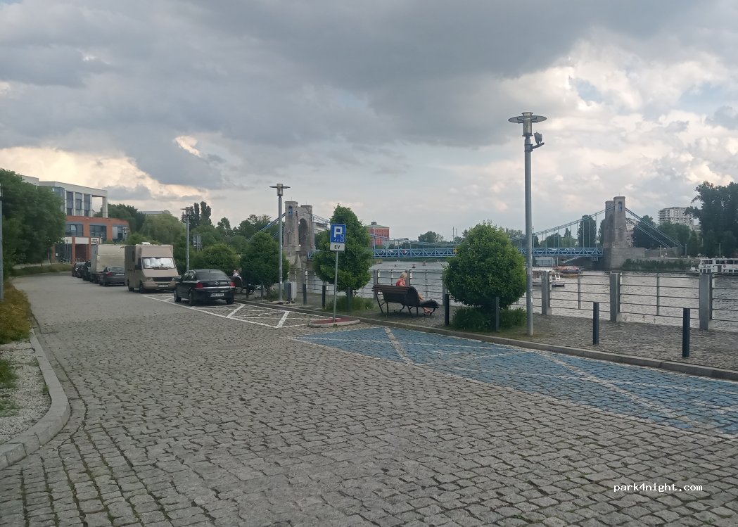 Parking au bord de la rivière Odra avec belle vue sur le pont Grunwaldzki. C'est une cul-de-sac au milieu de la ville. C'est un bon point de départ pour visiter les lieux les plus importants de Wroclaw. Un peu bruyant la nuit à cause de la circulation et des tramways, et parfois des rencontres étudiantes. Gratuit uniquement le week-end, du lundi au vendredi payant entre 9h et 18h.