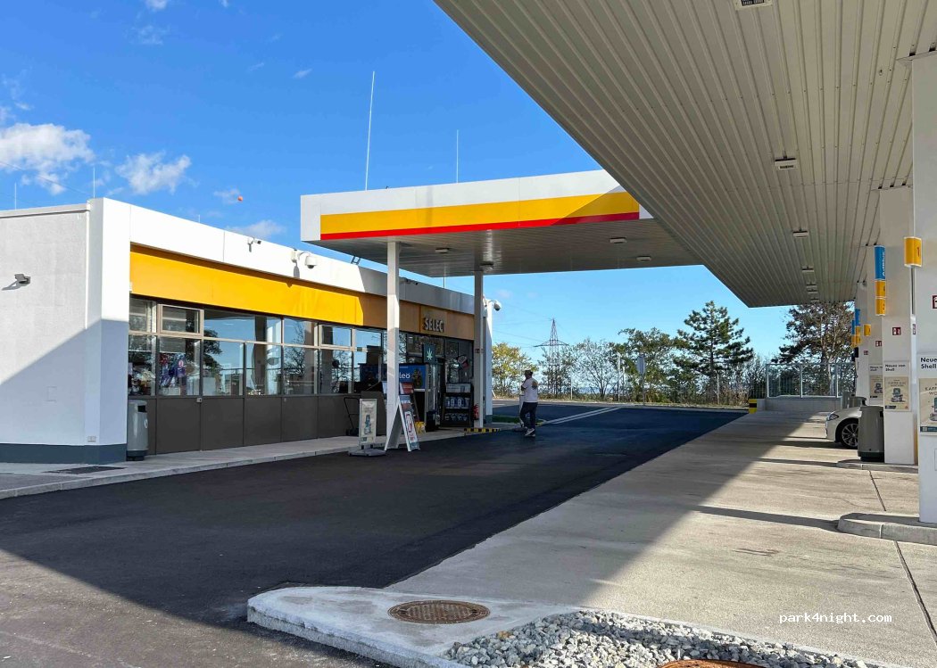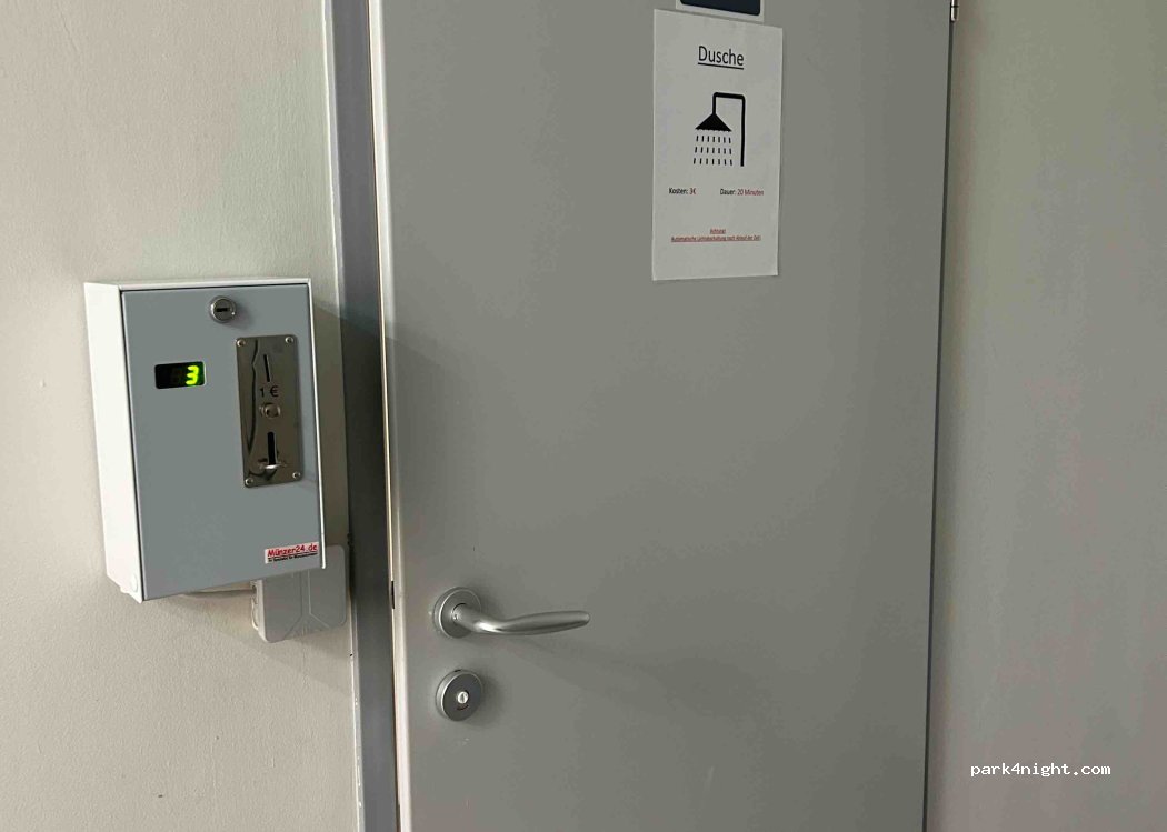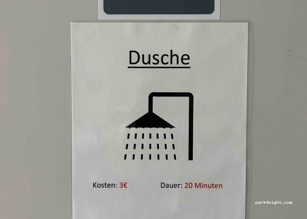 Prysznic 1€ za 10 minut (13.07.2024) - bardzo duże pomieszczenie i czysto. Dużo ciężarówek na nocleg, pauzę. Względnie cicho biorąc pod uwagę bliskość autostrady. Na nocleg wybraliśmy jednak inne, całkiem spokojne miejsce.
