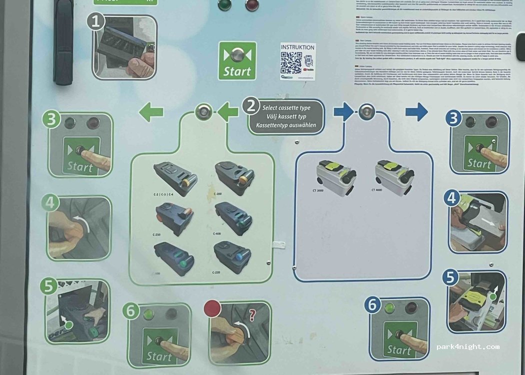 Camperclean einwandfrei genutzt, kostenlos: 1. Start drücken 2. Kassette auswählen 3. Start drücken (CC öffnet sich) 4. Kassette einfüllen 5. Start drücken und warten 1-2 Minuten, CC öffnet sich automatisch, Abwasser kann man ebenfalls lassen und Frischwasser auffüllen