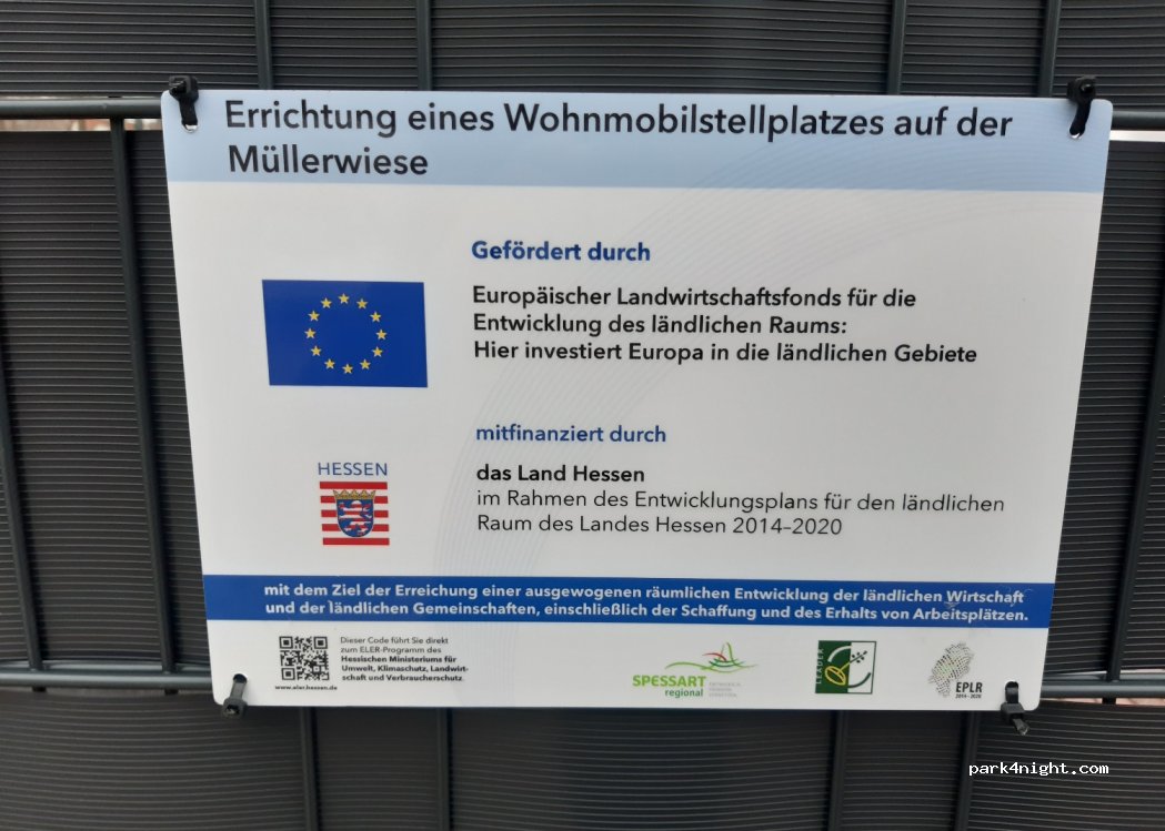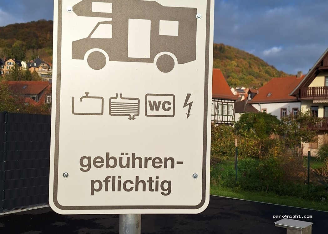 Gelnhausen city parking space. Spacious parking spaces on grass pavers. Center 500m, bakery 400m. Various restaurants in the vicinity. Disposal possible. Narrow access for large motorhomes.