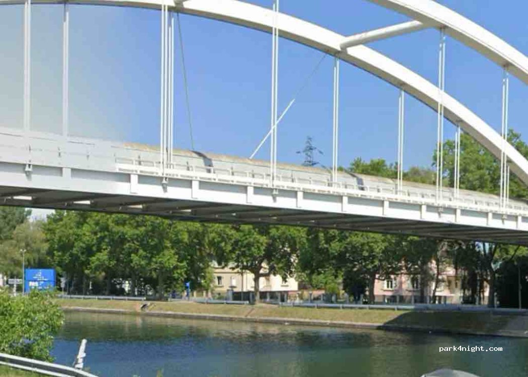 Gravel parking lot on the banks of the Rhône-Rhine canal. Quiet at night. Access to Rue de Dunkerque must be before 6 p.m. (automatic gate). To exit the street, ring the gate intercom
