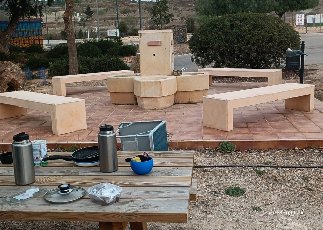 A water fountain, picnic table and fairly even ground. A good place to stay for a night. Be respectful of the local community, you'll be parking by their graveyard.