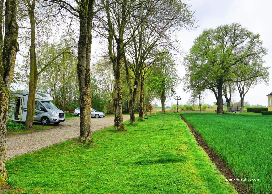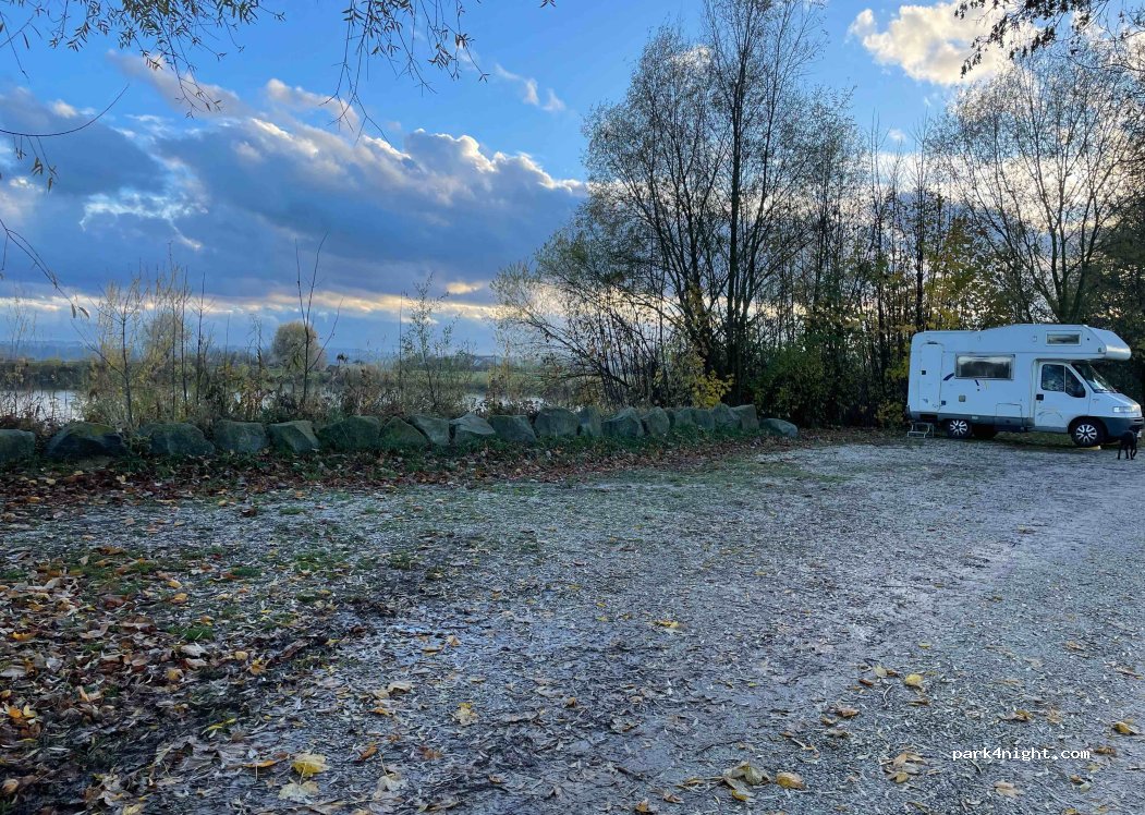 Right on a pond, very quiet. Small chapel next to it. Ideal for parking for 1-2 nights. Supermarkets within walking distance about 10 minutes. Take the rubbish back with you!