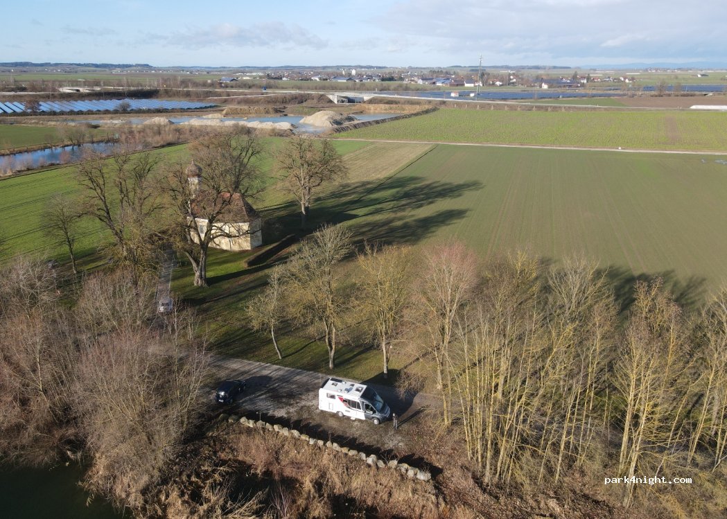 Direkt an einem weiher, sehr ruhig.Kleine Kapelle daneben. Ideal zum parken für 1 -2 Naechte. Supermaerkte in gehweite ca. 10 Minuten. Muell wieder mitnehmen!