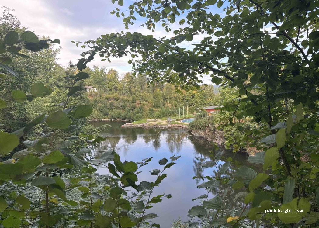 Großes Areal, jedoch teils ziemlich schräg. Die Äste hängen recht tief, so dass man auf den Lack aufpassen muss. Wer im Hellen anreist, kann sich besser einen guten Platz suchen. Im nahegelegenen Schwimmbad bzw. auch außerhalb der Öffnungszeiten an der hinteren Zeltplatzwiese gibt es Toiletten. Mit dem Hund kann man auch eine kleine Runde um den See drehen. Die Autobahn ist leicht zu hören.