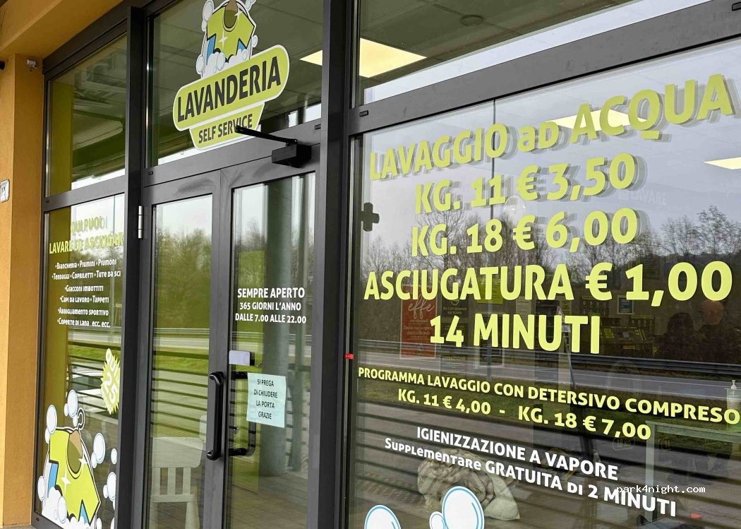 Lavanderia a gettoni aperta 365 giorni all'anno dalle 7:00 alle 22:00. Pagamento solo in contanti. Appena fuori dalla strada e parcheggio facilmente accessibile. Possibilità di passeggiare un po' nel bosco con i cani durante il lavaggio. Ristorante che sembra delizioso della porta accanto.