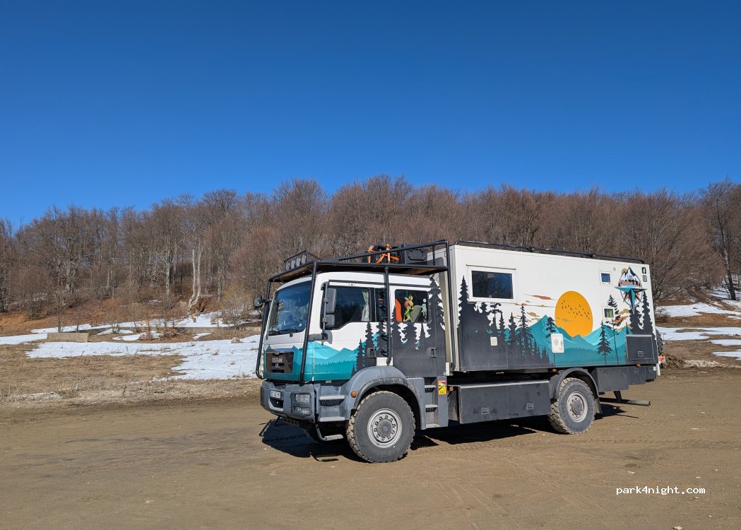 Glade at the edge of the road at the entrance of the fairly flat forest, and above all very close to the Buzludhza monument. We saw a big big grizzly in the morning in front of the van, so don't leave food outside! there are plenty of other parking lots on the road, sometimes with water.