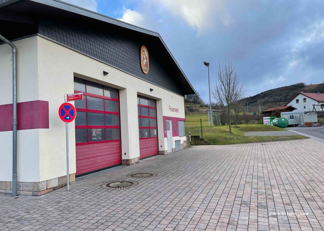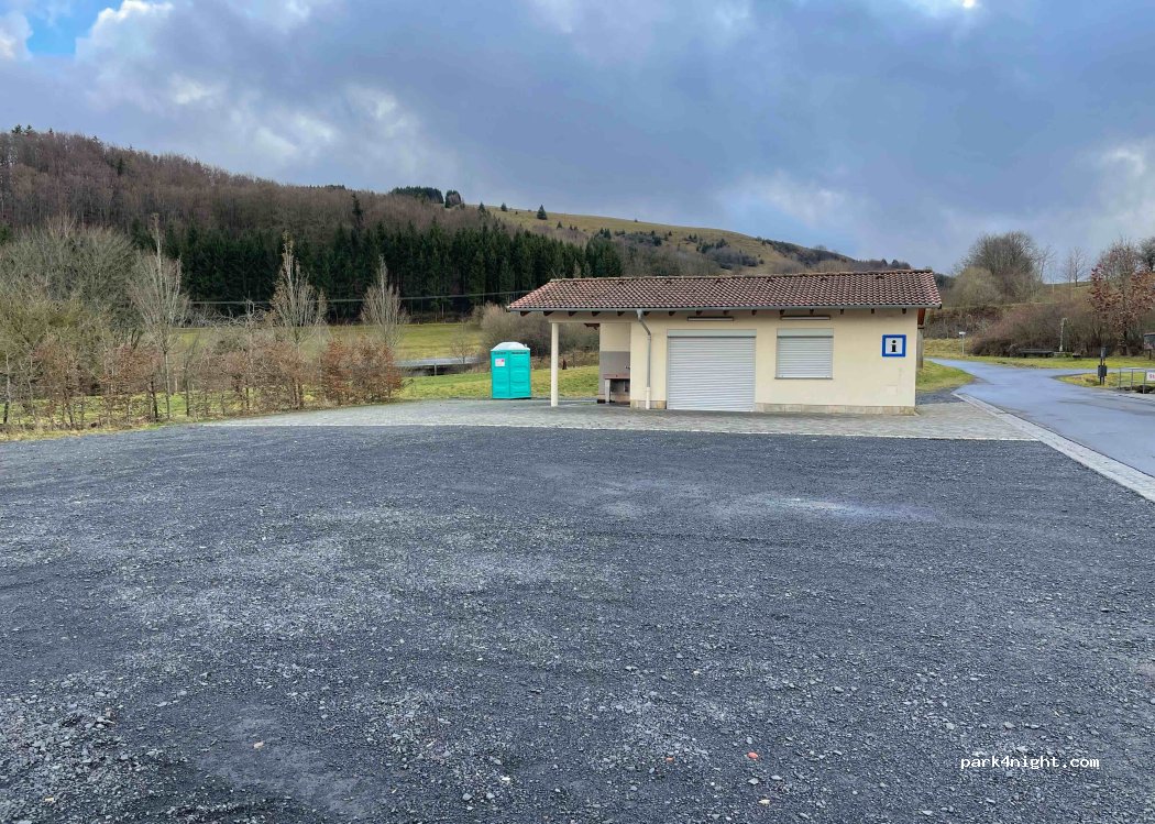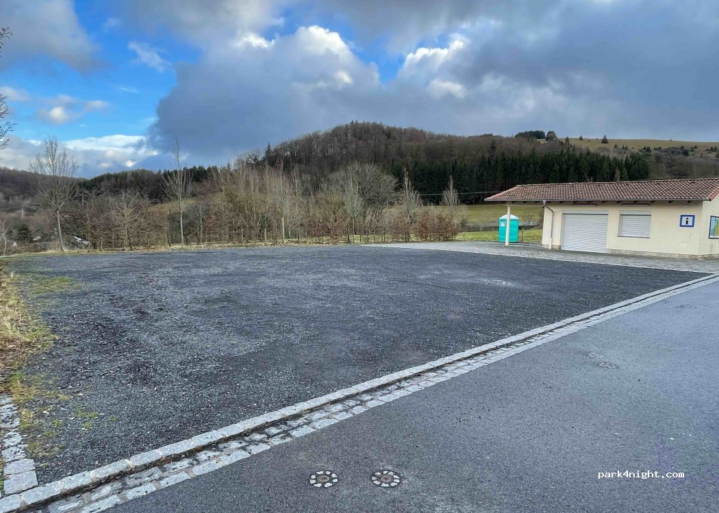 Small graveled parking lot opposite the DHG and the fire department on the outskirts of town. The surface is slightly sloping.