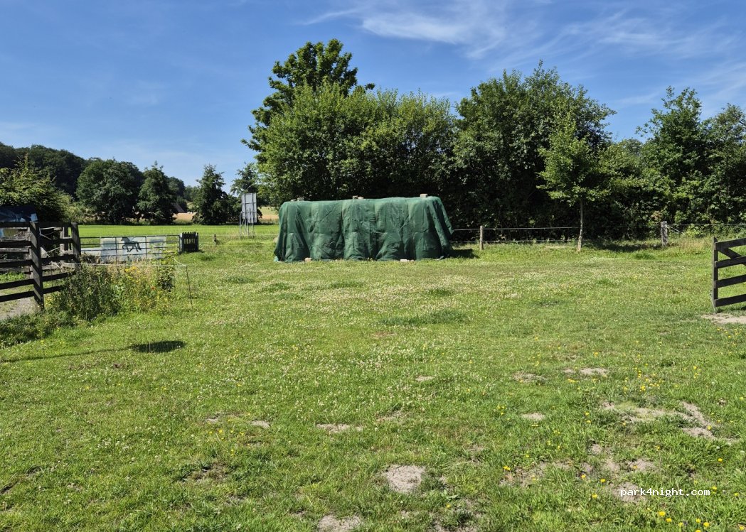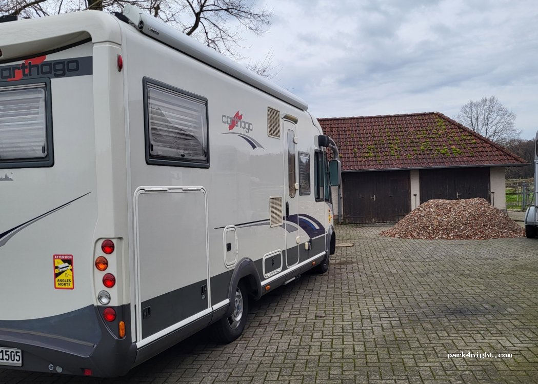 The location isn't bad, on a small farm with a few horses in very spacious and well-maintained paddocks. The parking space for the motorhomes is a small paved area between the house and the garages, where they also leave other vehicles and materials, but it's fine. However, it's right next to the road, and it was unfortunately a bit noisy when we were there; otherwise, it's nice.