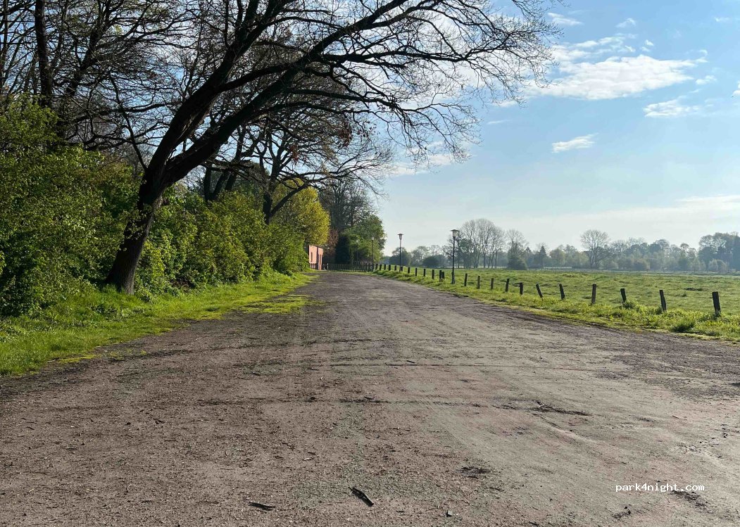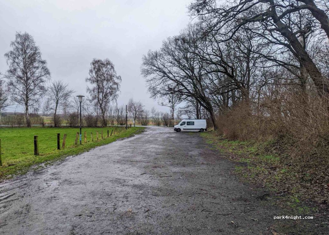 Aparcamiento tranquilo en el campo cerca de un lugar para eventos. Lo suficientemente grande para varios coches y autocaravanas. No hay señales de aparcamiento, aparentemente aparcamiento público con bancos y cubos de basura. Me quedé aquí tranquilamente por una noche sin comportamiento de acampada. No muy lejos de la carretera principal pero lo suficientemente lejos como para que no se escuche ningún ruido.