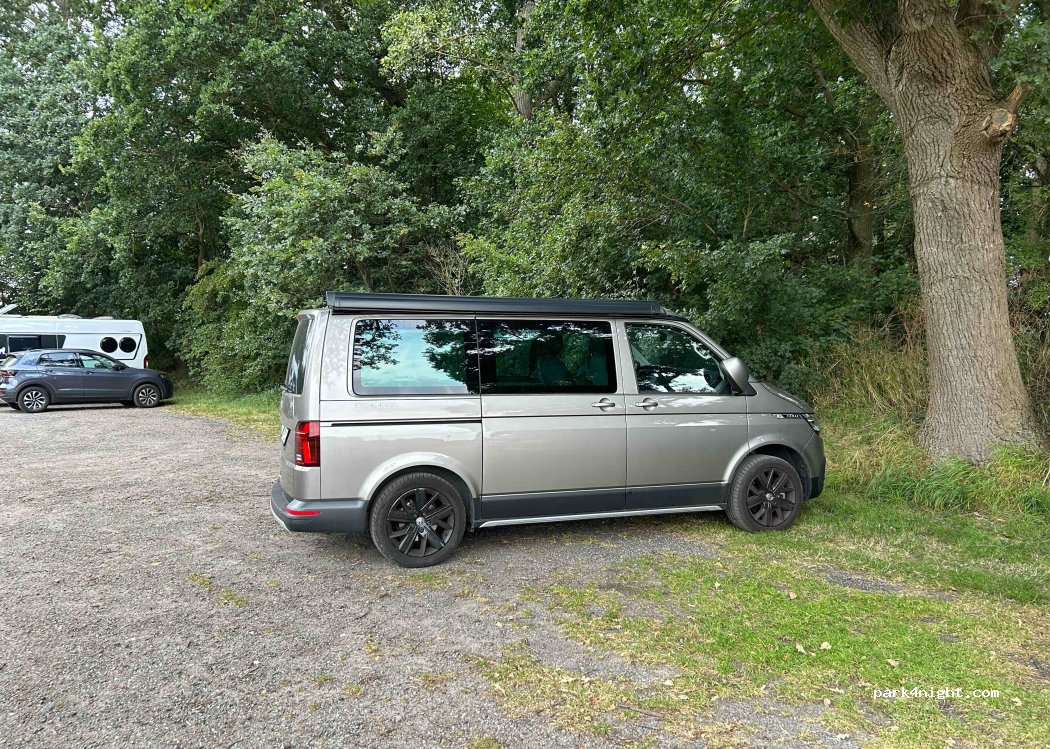 Ruhiger Parkplatz mitten in der Natur in der Nähe einer Veranstaltungsstätte. Groß genug für mehrere Autos und Campervans. Keine Parkbeschilderung, offenbar öffentlicher Parkplatz mit Sitzbänken und Mülleimer. Standen hier ruhig für eine Nacht ohne campingähnliches Verhalten. Unweit der Bundesstraße aber weit genug, sodass man keinen Lärm hört.