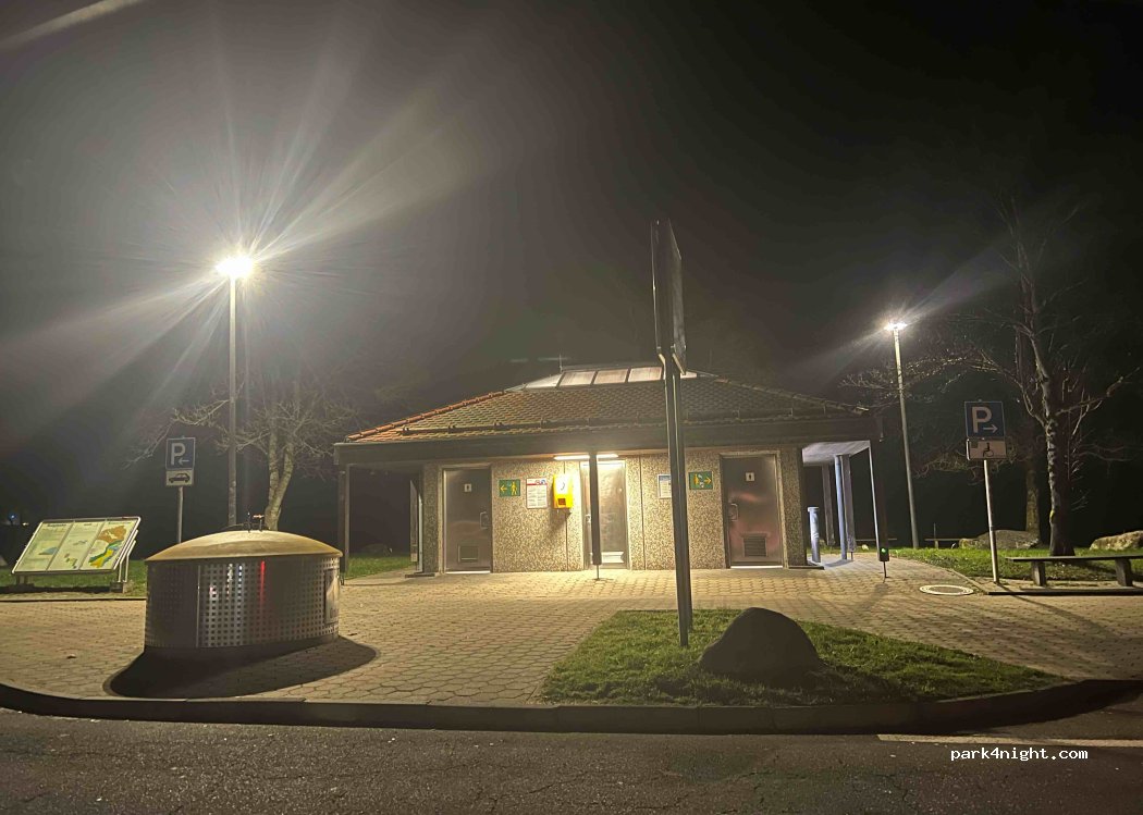 Kleiner Parkplatz mit kostenloser Toilette und Mülleimer.