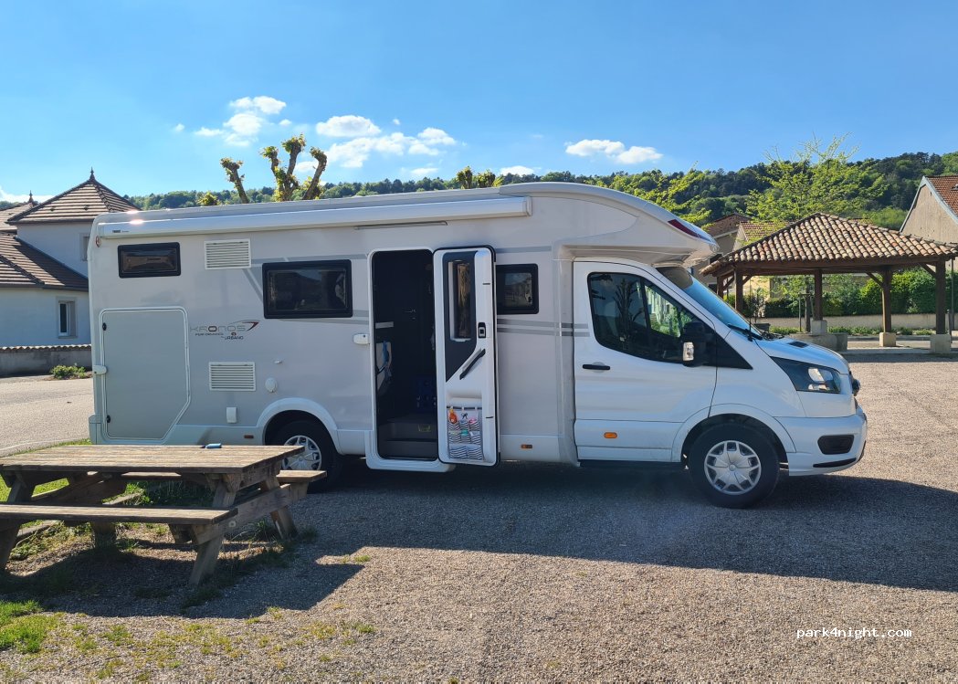 Parfait pour une nuit! belle grande place au centre du village, terrain plat et sur gravier. calme et sécurisant. vidange eaux grises aisée, services disponibles avec jeton semble t il, nous ne les avons pas utilisé. une halte gratuite et donc parfaite.