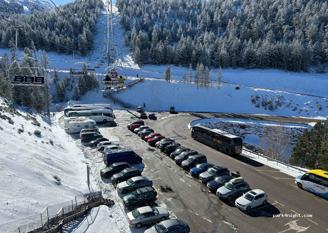 Parquing para furgonetas y autocaravanas con plazas delimitadas con la señal. En invierno puedes disfrutar del sky, excursiones con raquetas, parque lúdico,.. La resta de año con excursiones btt, andando, parque ludico o con todo terreno hasta el pic de l’Orri.