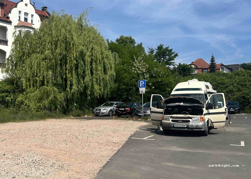 Parking facile à quelques pas de la ville historique. 4 places sont désignées, le parking lui-même est grand et rarement plein. Il y a récemment eu un avis à l'entrée : Stationnement 1 heure Après des recherches intensives : Cela ne s'applique pas aux 4 places de parking du mobil home ! Les informations étaient disponibles auprès des usines de vêtements Hersfeld ci-dessus. Les toilettes peuvent être utilisées dans le musée « Wortreich » ou au-dessus de la clinique.