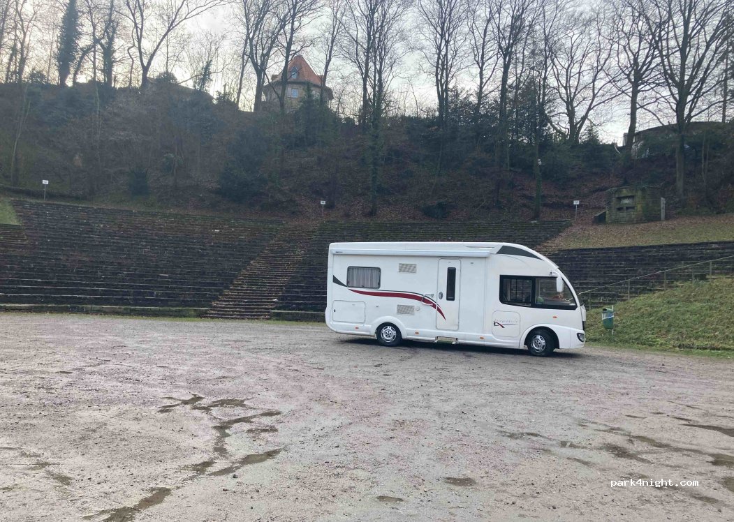 Man übernachtet nicht immer im Amphitheater! Anfahrt steil und über Kopfsteinpflaster für uns 6,40 Kasten gut machbar. Adresse fürs Navi Hermann-Löns-weg