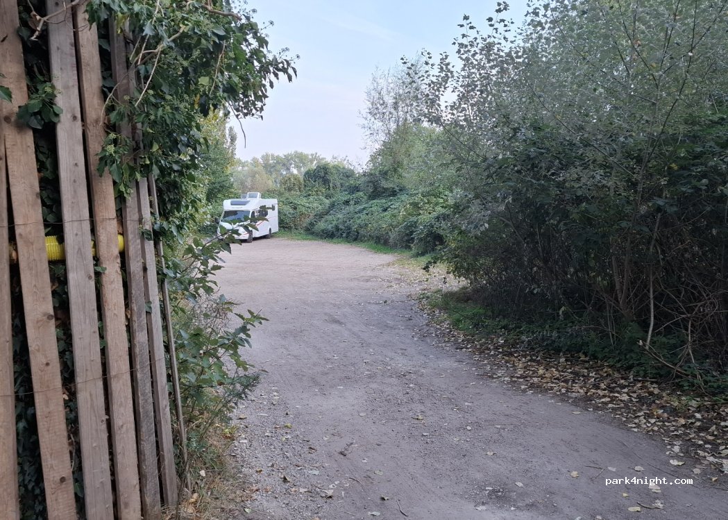 Ruhiger Standort im Grünen. Mehrere Parkplätze vor dem Eingang einer Kleingartenanlage. Sandiger unebener Weg, für große Wohnmobile eher nicht geeignet. Morgens ab 8Uhr laufen Fußgänger und Jogger über den Parkplatz.