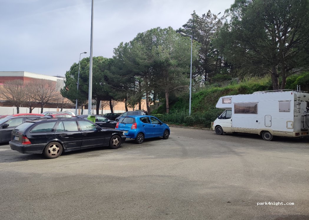 Goed voor een nachtje, vlak naast almada forum shopping geen hoogte beperking. Is een gewone parking met enkele plekken onder de bomen. Vlak naast drukke baan maar ok voor 1 nacht. Wij kwamen aan rond 21u bleven een nacht en konden zo s morgens vroeg naar de shopping. Overdag is de parking goed gevuld en moeilijker om een plek voor grotere campers te hebben.