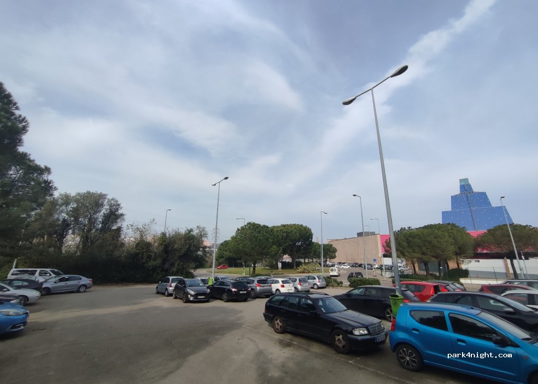 Bon pour une nuit, juste à côté du forum shopping d'Almada, aucune restriction de hauteur. Il s'agit d'un parking normal avec quelques places sous les arbres. Juste à côté d'une route très fréquentée mais ok pour 1 nuit