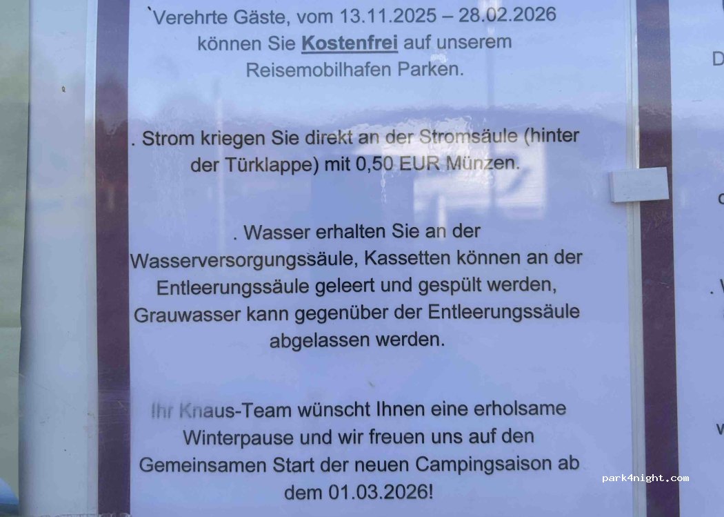 Der Knaus-Campingplatz verfügt über zwei Wohnmobilstellplätze. Der erste befindet sich innerhalb des C. - Platzes. Dieser Teil ist geschlossen. Der zweite Womo-Stellplatz ist vor dem C. - Platz und kann gem. dem Aushang der Infotafel, welche sich an der VE befindet, in den Wintermonaten kostenlos genutzt werden. Strom und Wasser wird gegen Gebühr an den entsprechenden Säulen angeboten.