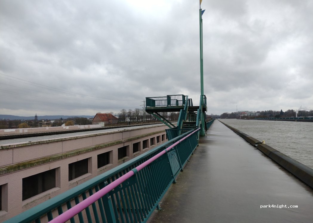 Parking lot for easy access to the “Minden Waterway Cross” viewing point on the Mittelland Canal. Not for long periods of storage or overnight stays. Parking lot is closed to trucks, otherwise no restrictions. Entering the paths up to the canal is expressly permitted. Cross the street to the viewpoint, down to the Weser, turn left under the bridge and up the steps on the left. Then you are between the two water strips of the Mittelland Canal.