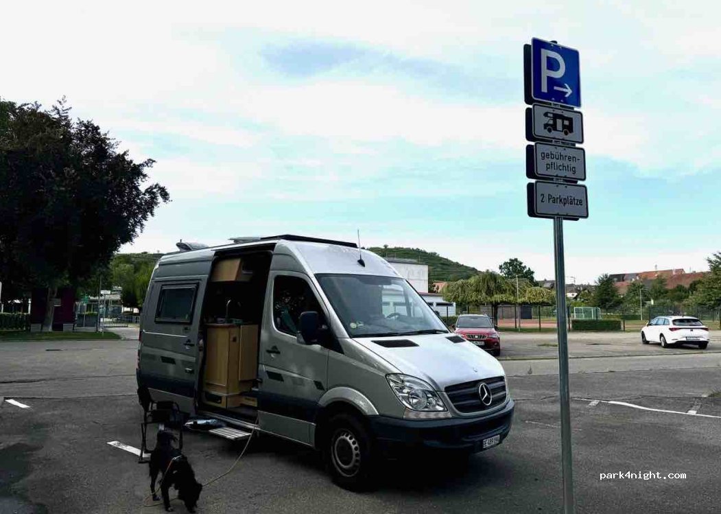 This is the car park at the Kaiserstuhlhalle in Ihringen. The municipality of Ihringen provides two spaces here. In the middle of the wine-growing town, you can enjoy short walks to inns and wineries. A public toilet is located right next to the parking space.