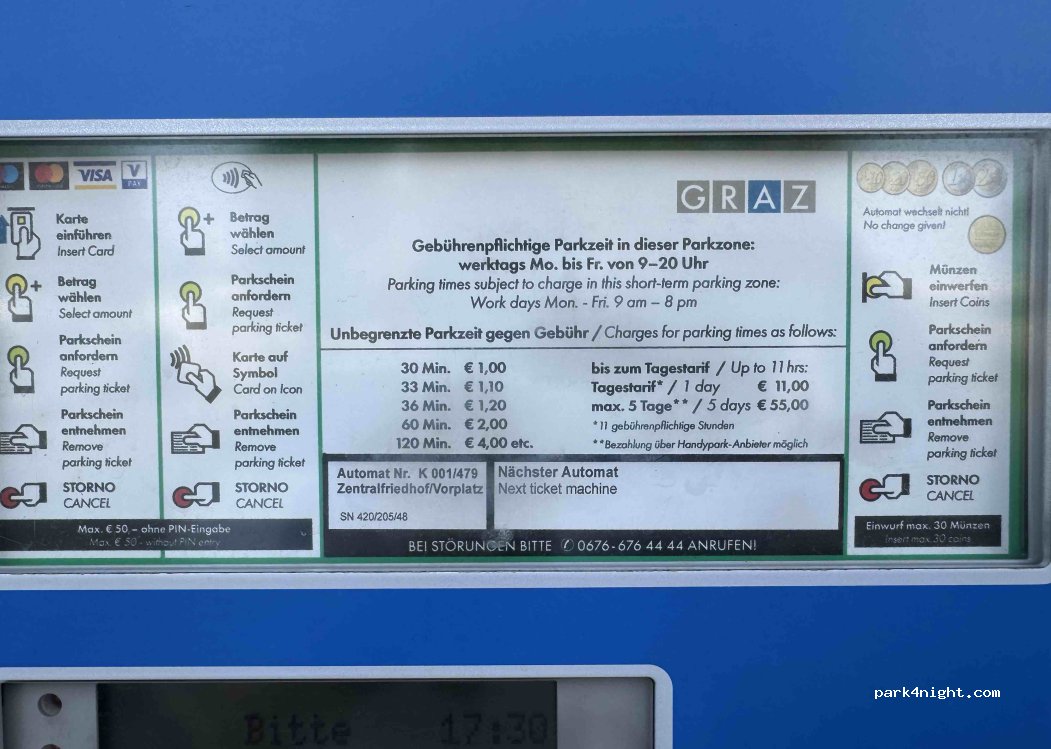 Parkin para visitar Graz , el Tram es gratuito para ir al centro . Hay una parada delantw de lantienda de flores i Cemwnterio . Pagamos un tiket de 6€ para 4h. Aparcar muy bien las autocaravanas que no sobredalgan , la parte trasera esta en la hierba No dormimos en Graz