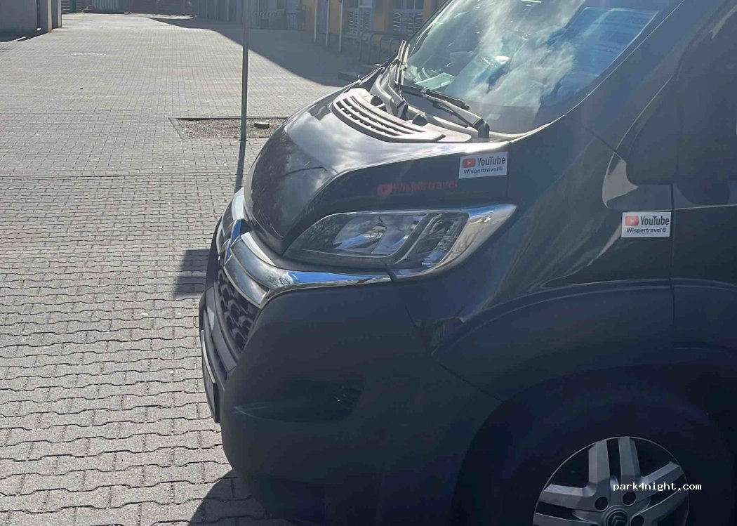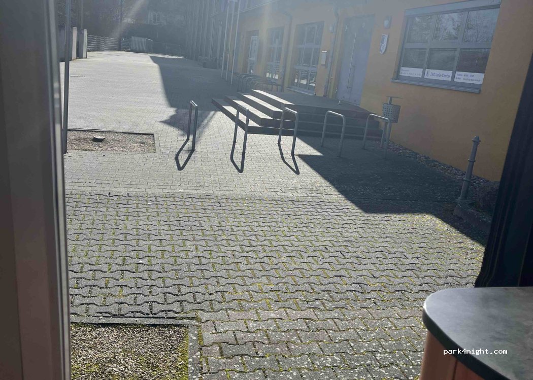 Mit Bäumen umstanden, ASTRA-Empfang nur an einzelnen Flecken. Sportler-Parkplatz, schräg. Habe hier in Frieden übernachtet.