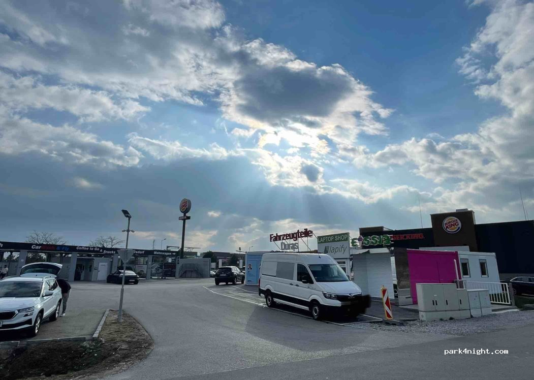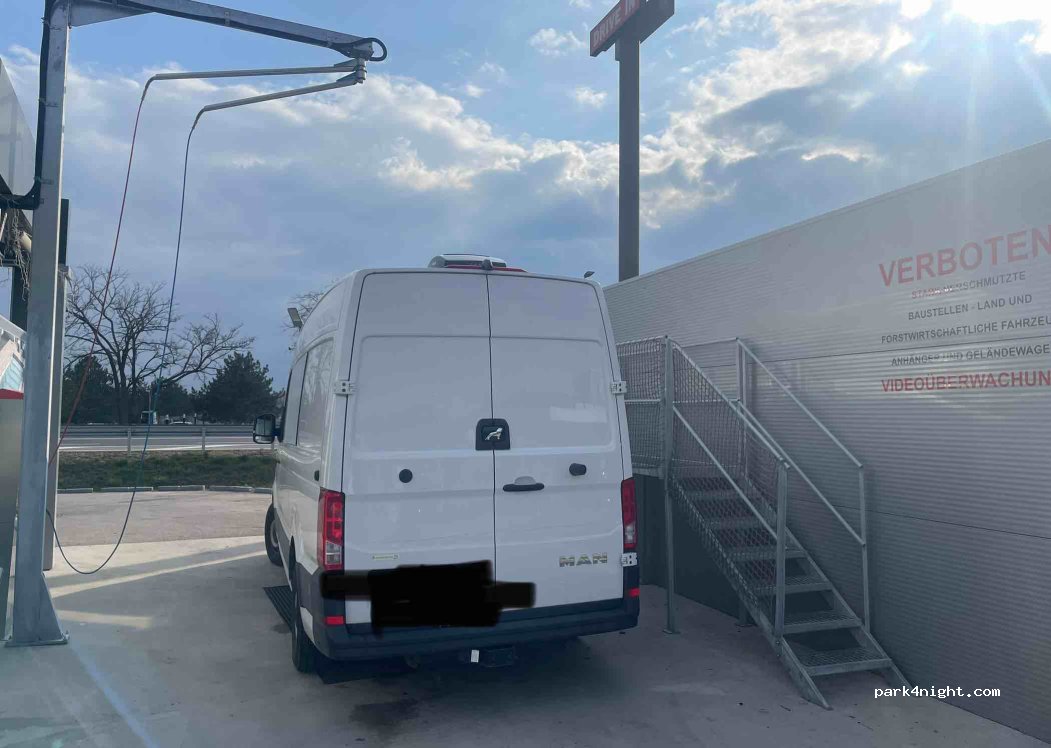 Great washing area for campers, with a grandstand where you can also wash the roof and the solar panels. No height limit! Many services on site. Even a dog washing machine (photo) Burgerking, vehicle parts, laptop repair, snack machines,…
