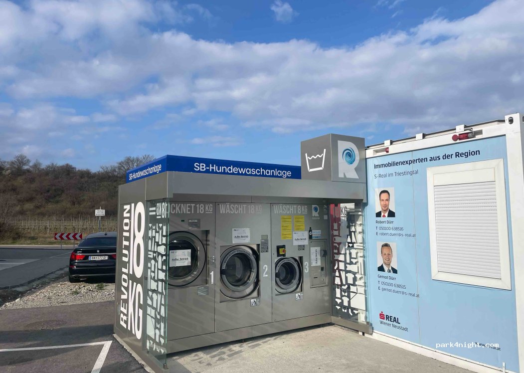 Amplia zona de lavado para autocaravanas, con stand donde también se puede lavar el techo y las placas solares. ¡Sin límite de altura! Muchos servicios en el sitio. Incluso una lavadora de perros (foto) Burgerking, piezas de vehículos, reparación de portátiles, máquinas de snacks,…