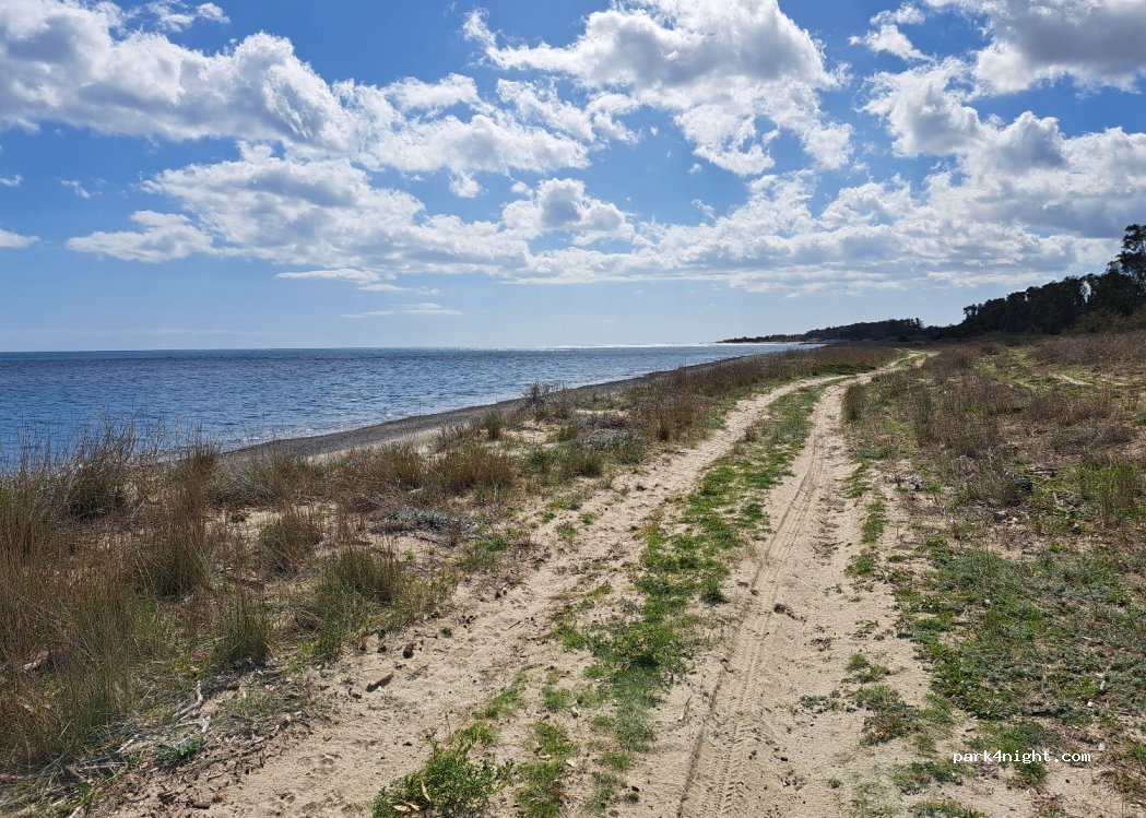 Sehr ruhiger und abgeschiedener Stellplatz direkt am Meer. Sie sind durch die Bäume vor dem Wind geschützt. Der Zugang ist etwas schwierig. Es gibt tief hängende Äste und einen ausgewaschenen Weg.