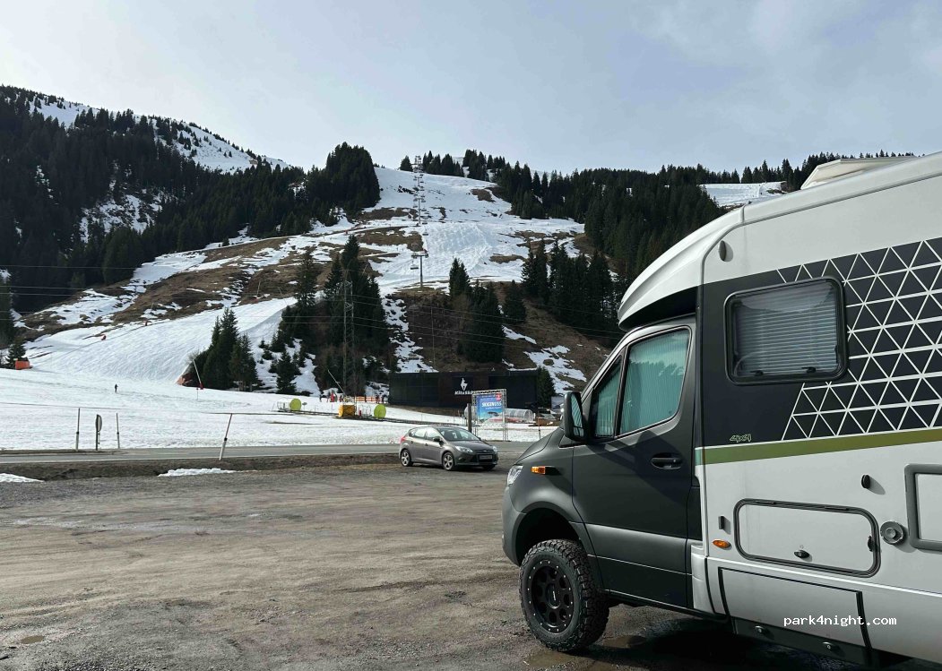 Stayed for two night during ski season. Perfect for getting onto the slopes. 3 other RVs around, so it seemed fine to stay overnight for the authorities. No facilities, but also free of charge. The bar across the street plays quite loud music.