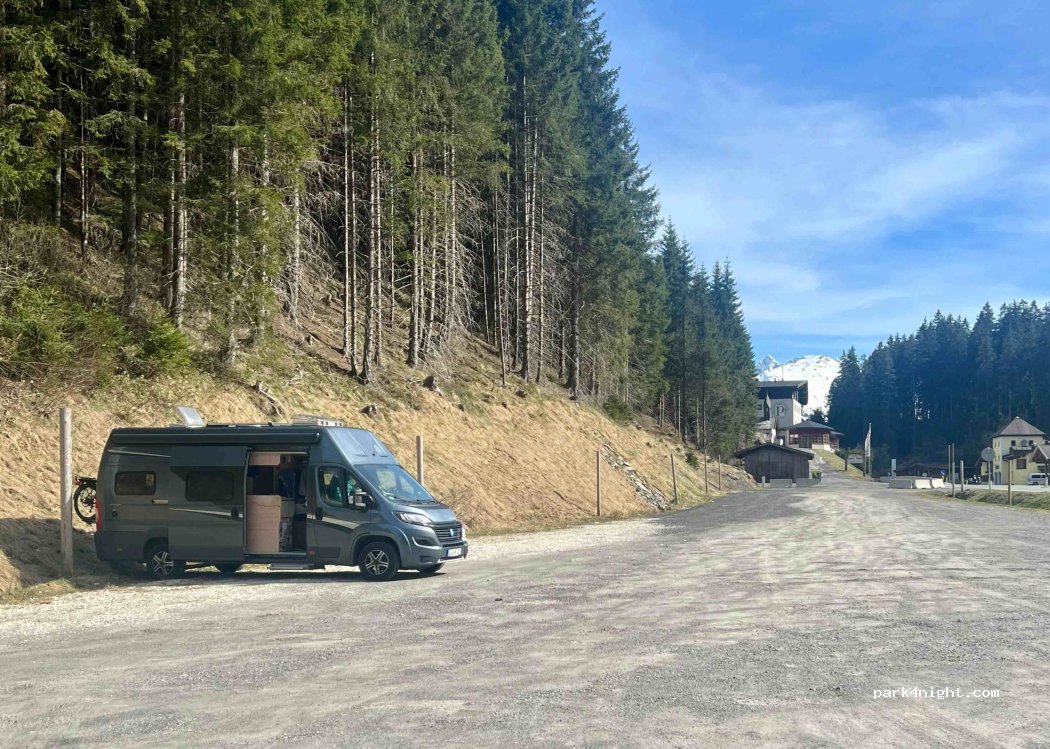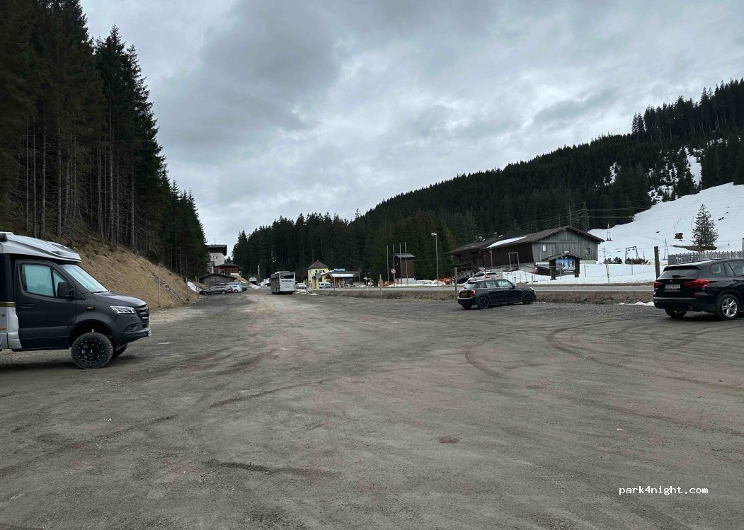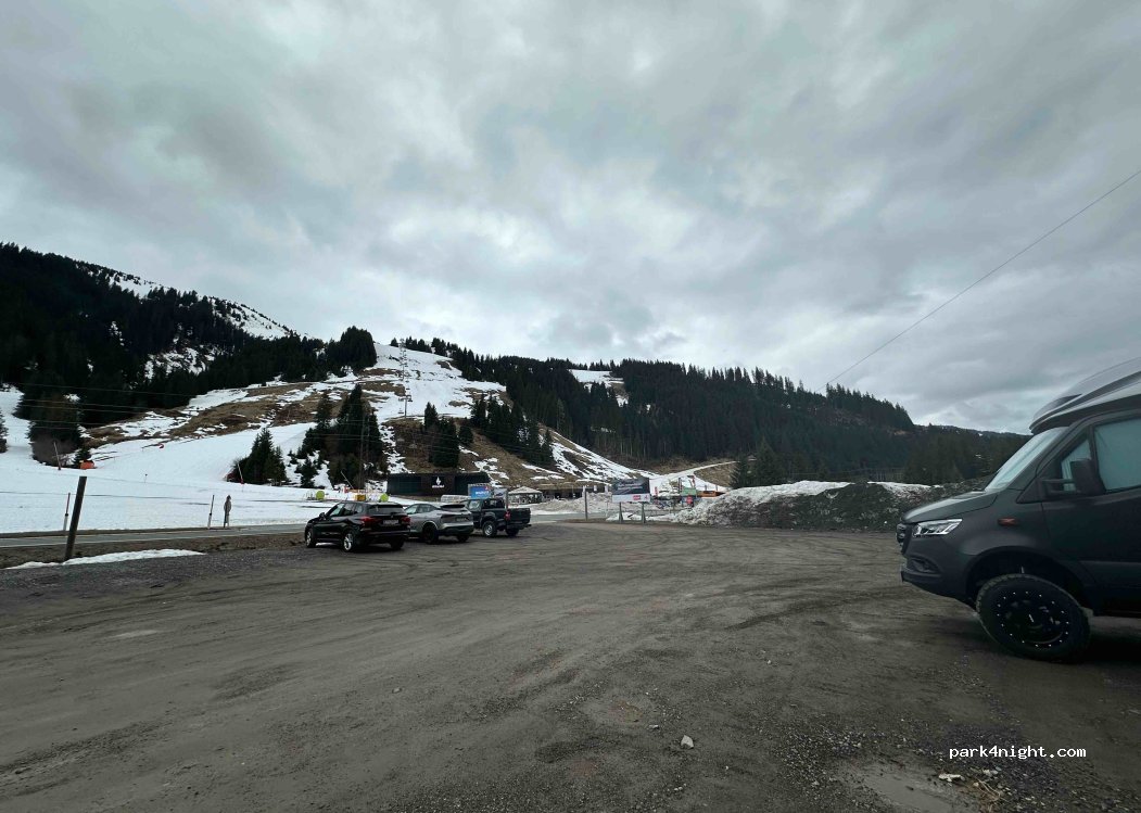 Großer Schotterplatz mit guter Sicht auf den Skihang, auch am Samstag Vormittag viel Platz, der große Parkplatz war fast leer. Keinerlei Schilder oder Probleme, der Verkehr ist am Tag allerdings recht laut, viele Autos und Motorräder, die schnell vorbeifahren.