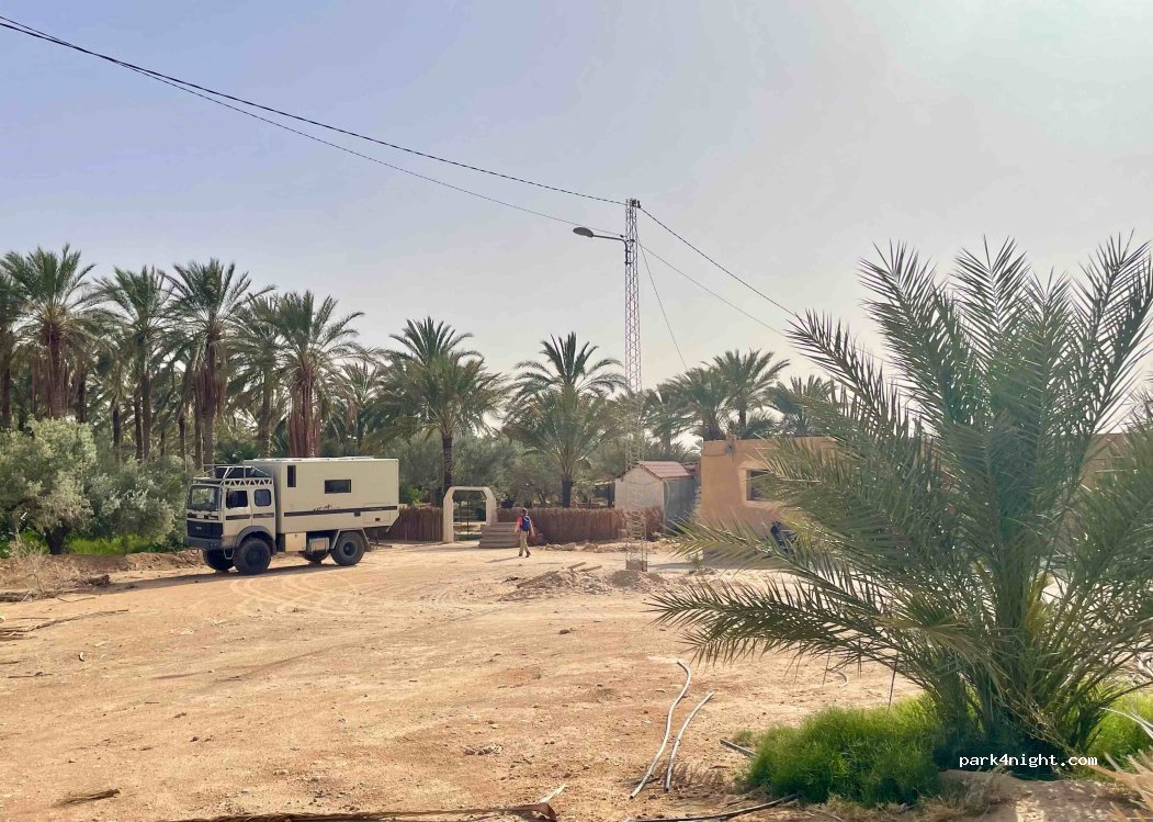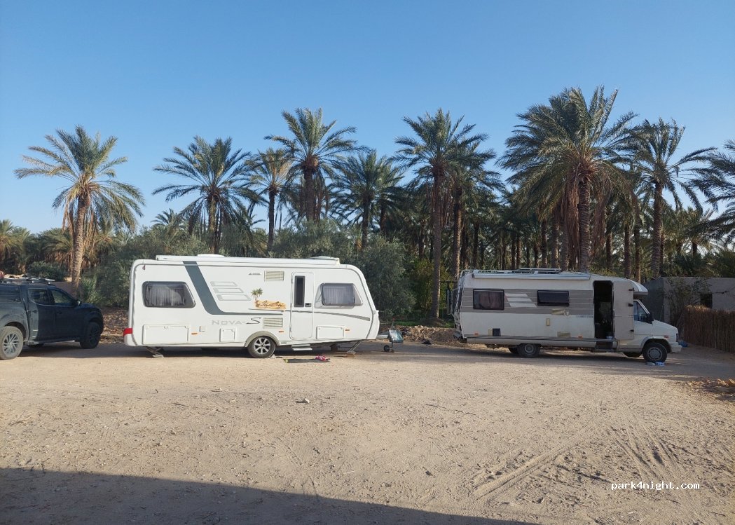 Sehr schöner Platz unter den Palmen, wo man gemütlich ausruhen kann. Der Stellplatz für die Wagen aber ist davor auf einem Schotterparkplatz. Ali, der Inhaber, ist sehr konvivial und seine Küche sehr zu empfehlen. Toiletten und Duschen sind sauber gewesen. Wir waren dort im Oktober 2025.