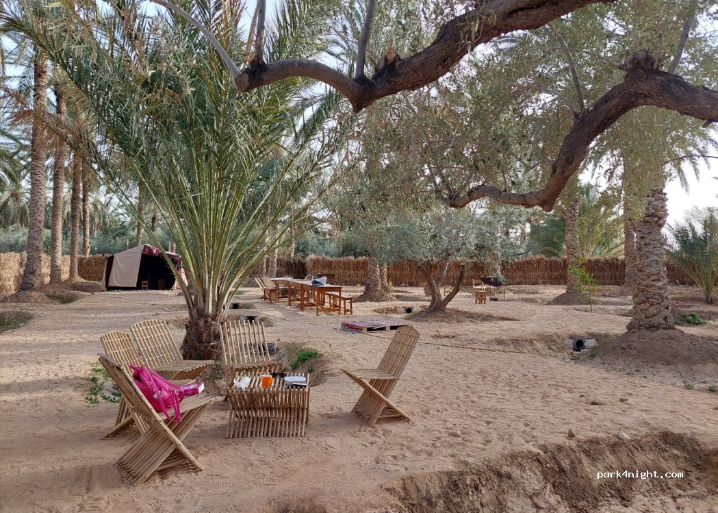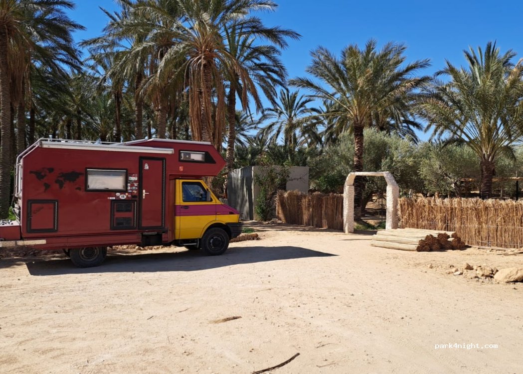 Campsite still under construction (04/24) on the edge of the palm garden. Mostly flat and sandy area. Ideal starting point for Rommel Piste and Gorge Seldja, Zimra, Oasis Chbika Tamerza, Midess.