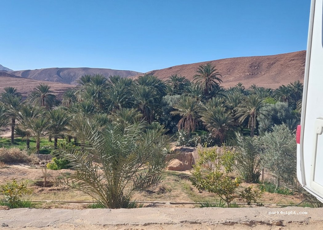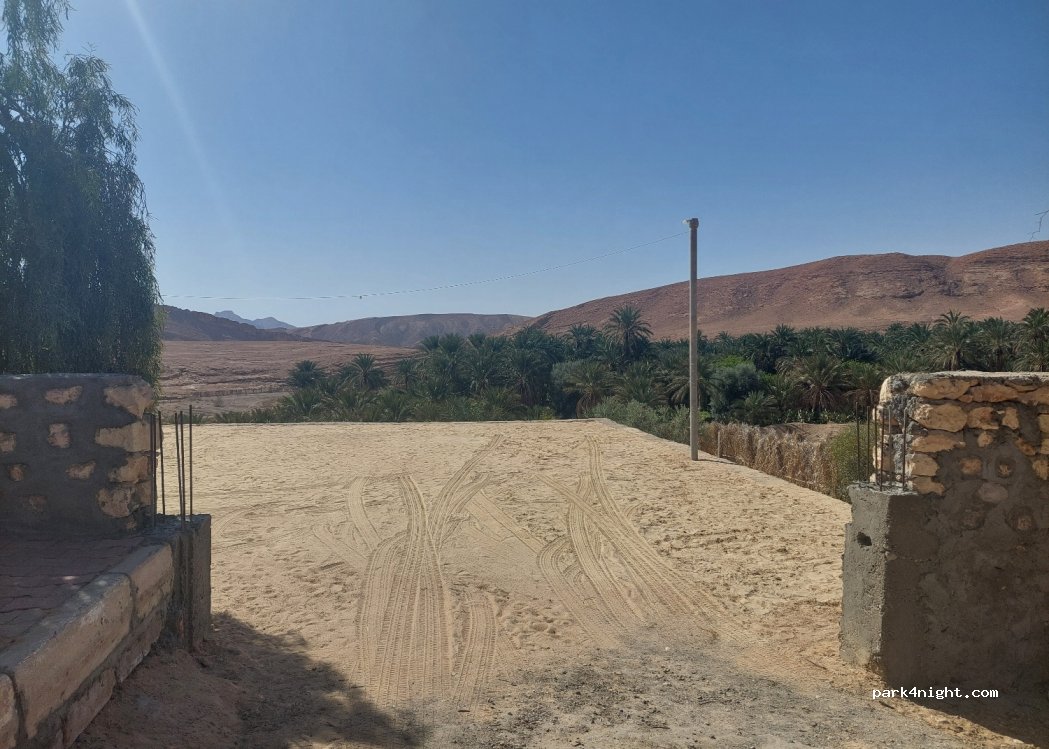 Espace plat et sablonneux relié au jardin de l'excellent restaurant "Mides Family Resto", avec une belle vue sur la Palmerie. Convient également aux gros véhicules. Point de départ idéal pour des randonnées dans des gorges à couper le souffle.