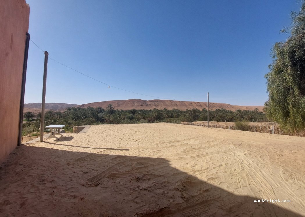 Parking sabloneux vraiment plat et qui domine la palmeraie qui jouxte le restaurant Vues montagnes. Endroit hyper calme c est vraiment un atout. Salah et son epouse tienne un tres bon restaurant ( 40 dt le menu complet ) 25 DT le parking. Electricite EN SUPPLÉMENT. Eau poser la question. Couple genereux accueillant discret et de TRES bons conseils.... pour les visites des environs
