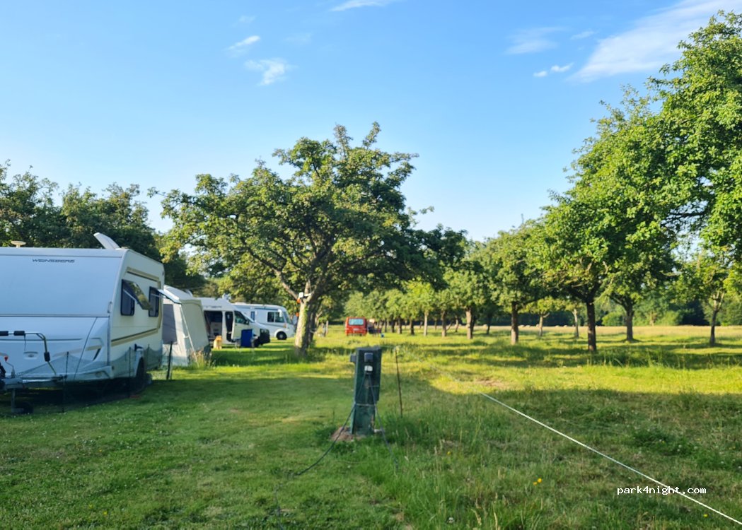 A beautiful, quiet campsite. You stand directly under the apple trees. The owners are very friendly and helpful. 1 motorhome with two people including electricity costs 13.50 euros. Payment only with cash. the sanitary facilities are simple but clean.
