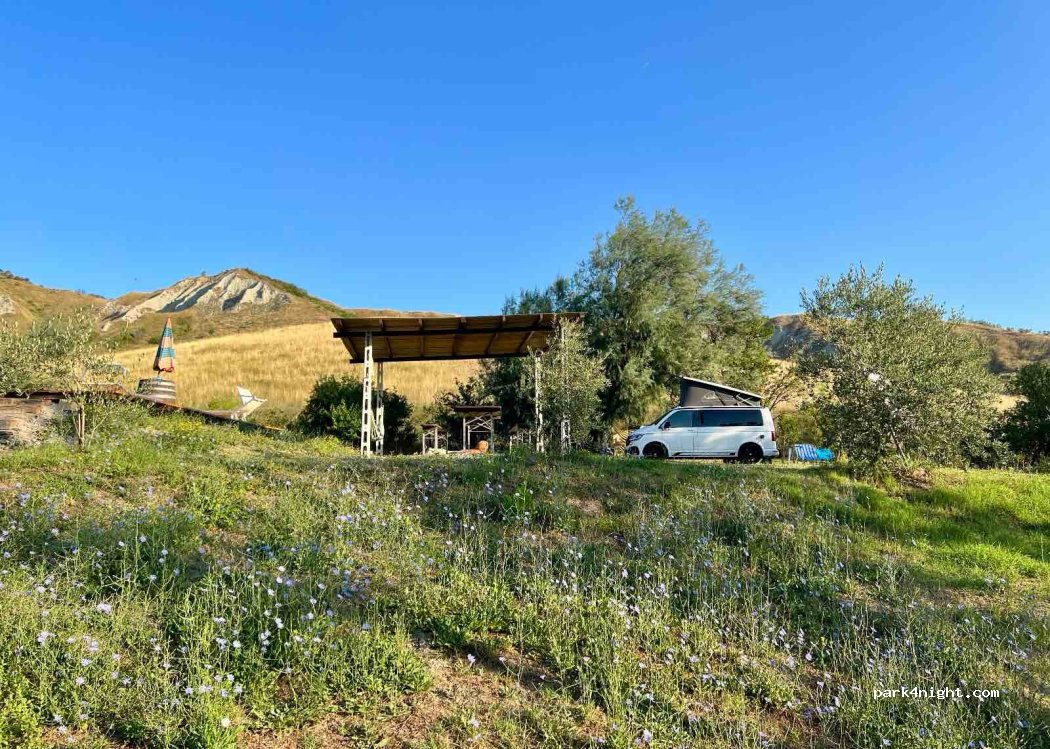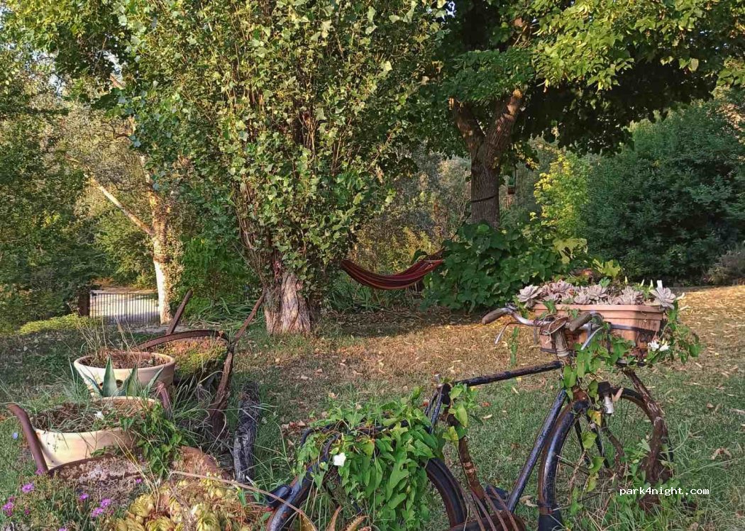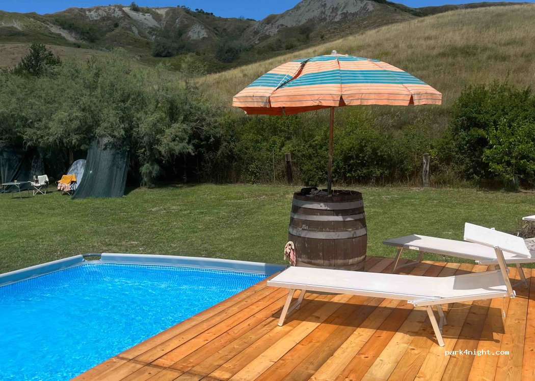 Oasis de tranquilidad y paz en medio de la naturaleza. Pietro el dueño ha sido muy amable y atento, dispuesto a ayudar en cualquier caso. Habla varios idiomas. No hay aguas grises ni negras, pero si llenado de agua limpia. Tiene baños, duchas, piscina, hamacas, mesas, wiffi. Hay opción de comprar bebidas frías a 2€, comida por 10€, desayuno 5€, electricidad 2€. Volveríamos sin dudarlo!