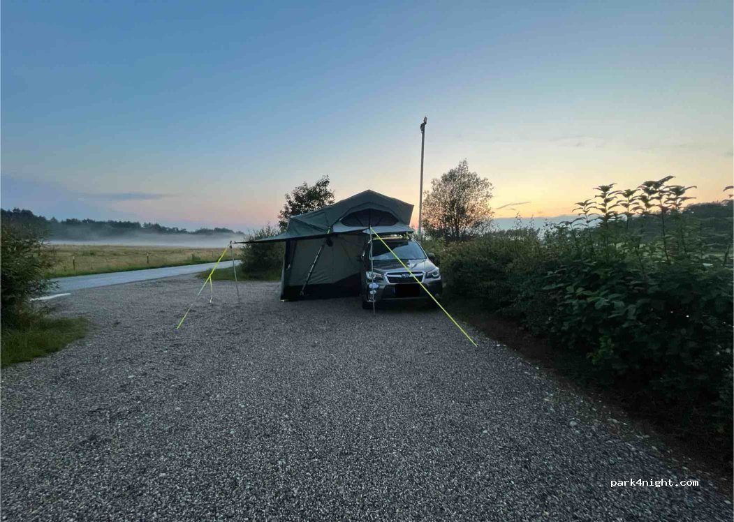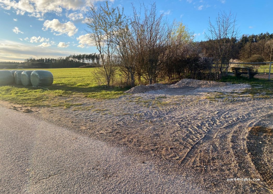 Sauberer SchotterPP (kl runde Steine), bei Trockenheit kein Staub, bei Regen kein Schlamm, geschützt hinter einer Hecke. WC & Aufenthaltsraum super. Sehr ruhig und abgelegen. Hofherr/Eigentümer tiefenentspannt & sehr freundlich. Es fahren zwei Wege dorthin, ein Weg führt mitten durch den Wald auf unbefestigten Straßen, aber mit Leichtigkeit (selbst ohne 4x4) zu befahren. Sehr gerne wieder!