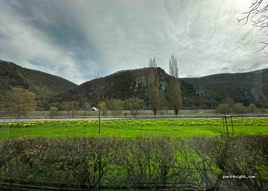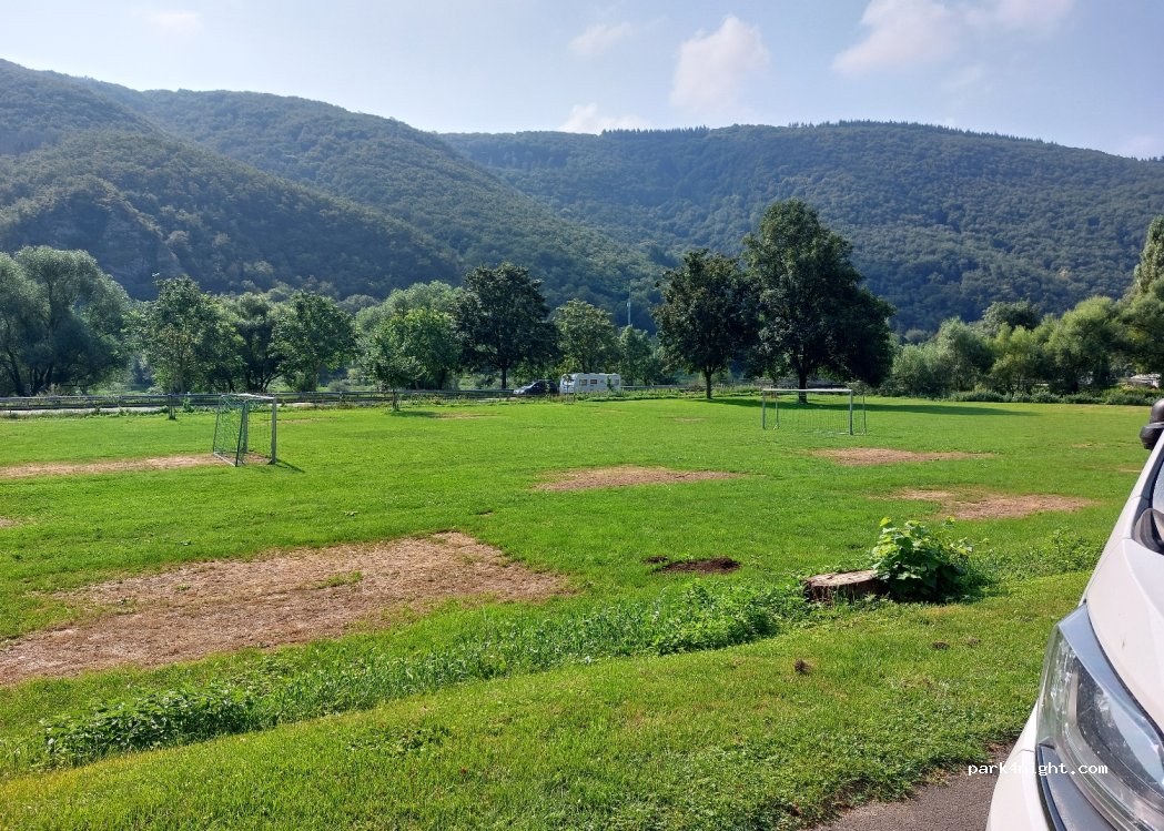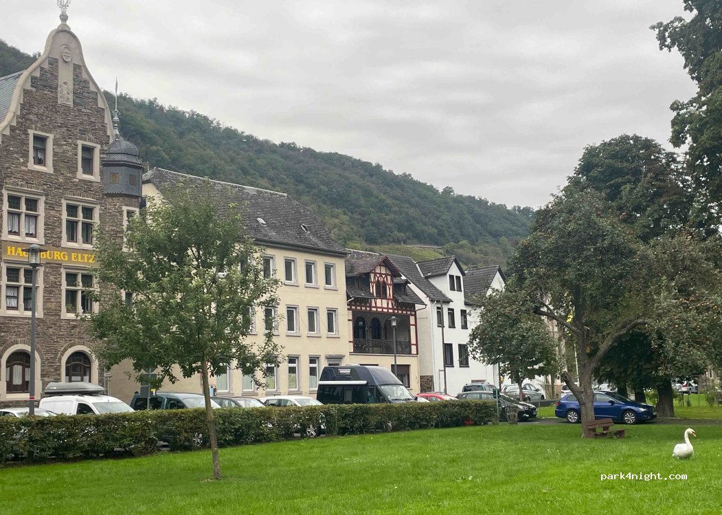 Sieht nach Anwohner Parkplätzen aus, es waren aber auch einige frei. Paßt gut für kleine Vans und Busse bis 5 m. Sind eben normale Parkplätze für PKW. Davor eine große Wiese mit Bänken und Schwan (siehe Foto), dahinter die abends ruhige Straße und dann die Mosel, auf der man Schiffe vorbeifahren sieht. Von hieraus ca 1 Std Wanderung zur Burg Eltz (oneway).