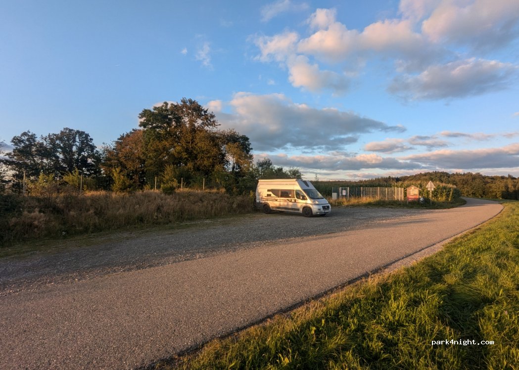ruhiger, fast ebener, geschotterter Parkplatz, der Platz für vielleicht acht Wohnmobile, auch längere, hat. Ruhige Lage zwischen Wiese, Feld und Wald an einer wenig befahrenen dreieinhalb Meter breiten Strasse.