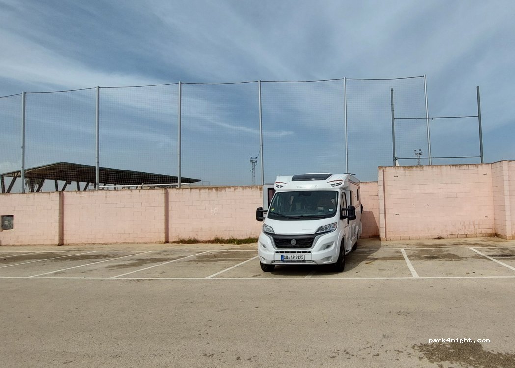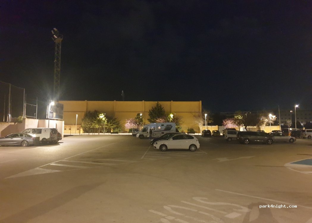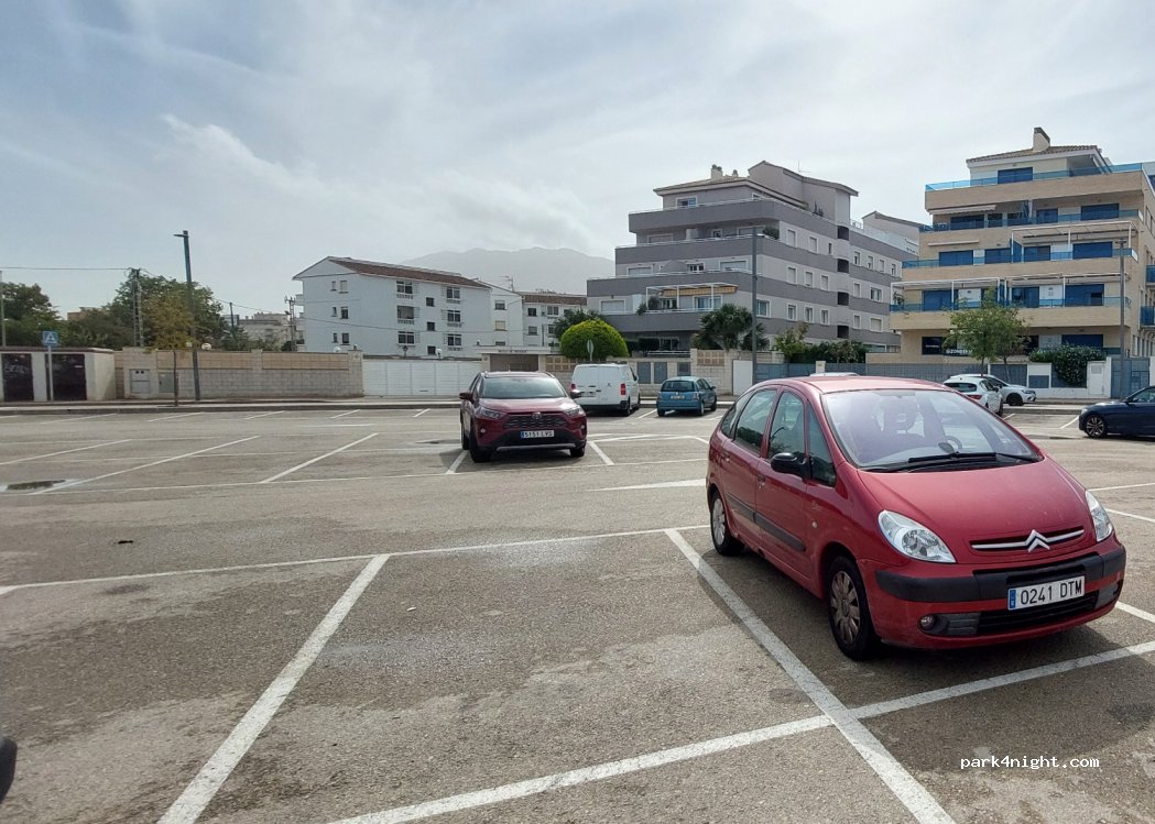Grosser, ebener, geteerter und kostenloser Parkplatz nahe am Zentrum gelegen. Keine Ver- oder Entsorgung, kein Strom. Wird abends mit PKW von Sportlern gefüllt. Guter Platz für eine Nacht und um Denia zu erkunden.