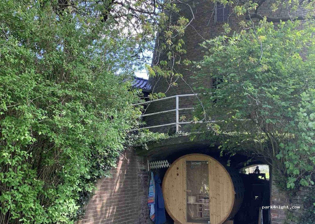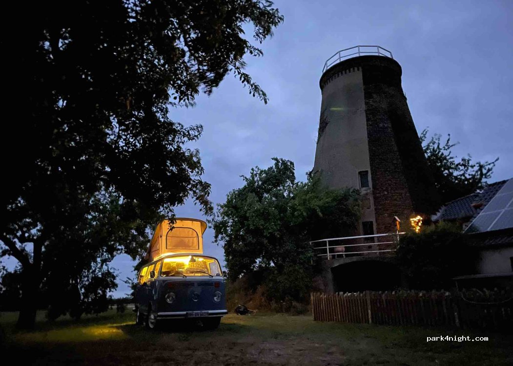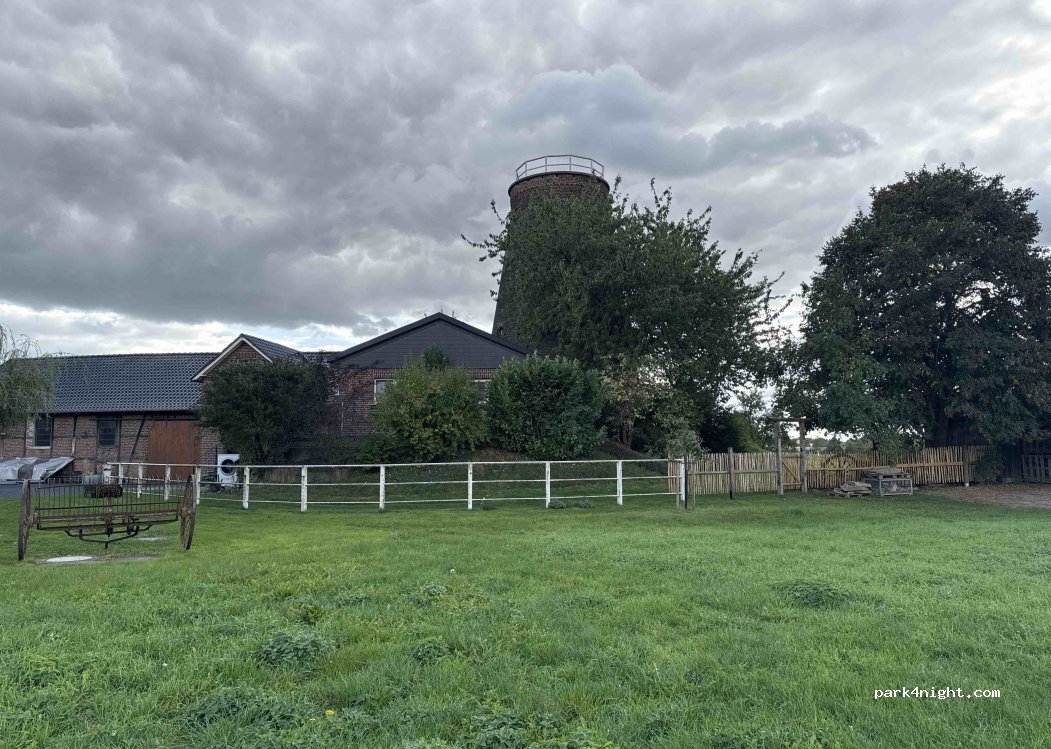 ◽️Vous camperez avec vue sur la tour du moulin et les bâtiments de la ferme. La tour du moulin est toujours un point d'intérêt majeur. Construite à la fin du XIXe siècle, elle a perdu ses ailes peu après sa construction suite à un incendie. Jusqu'à sa fermeture, le moulin était alimenté par une centrale de cogénération. Aujourd'hui, la tour est classée monument historique et abrite des faucons crécerelles, des hiboux et des corvidés.