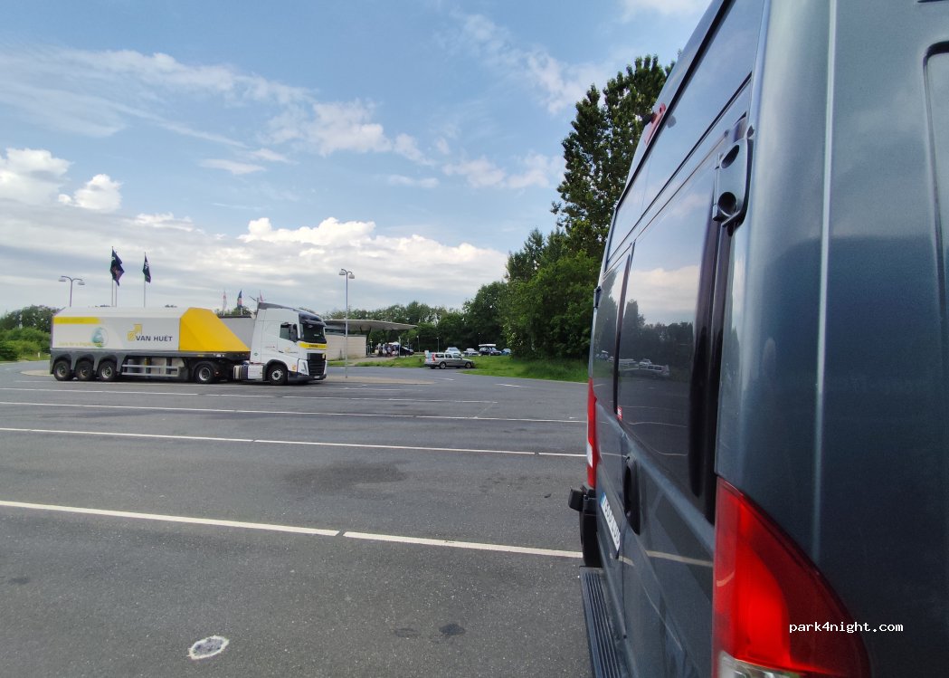 Aire d'autoroute avec espaces pique-nique excentrés où nous avons garé notre van. Bruit de l'autoroute un peu atténué. Parfait pour la nuit en transit.