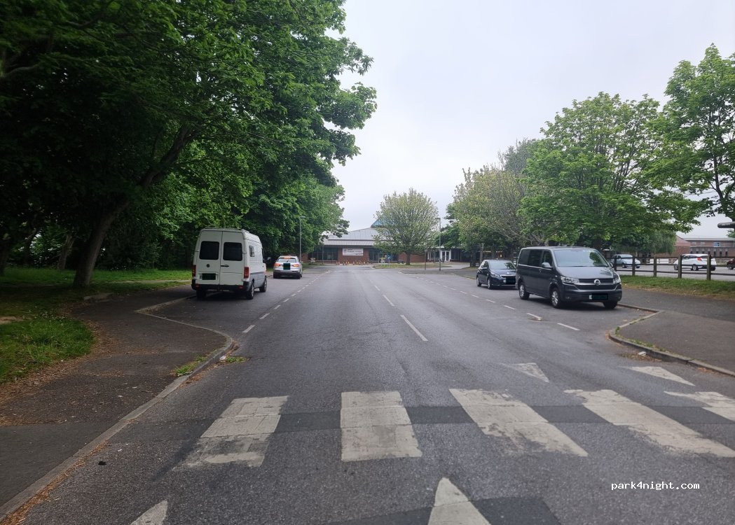 The spaces are enough for 3 vans on both sides of the road. Spent 1 Saturday night here. Leisure centre closes at 8.30pm so car park empties from then til about 9pm so no more traffic after that til about 6 to 7 am. Was super quiet all night.