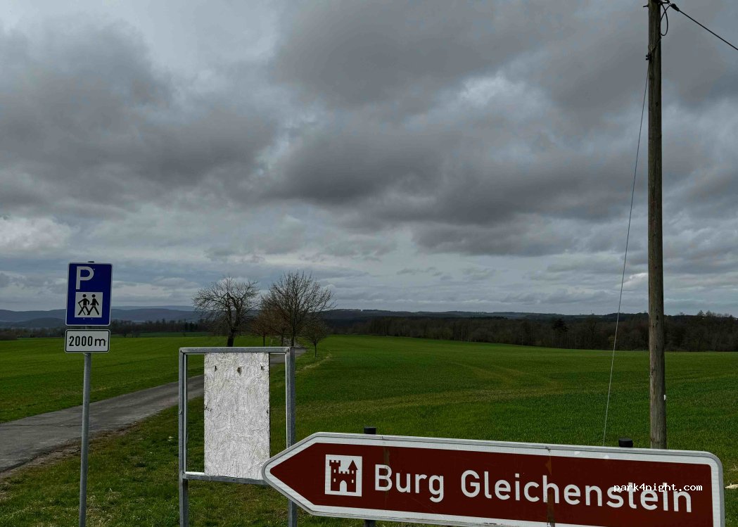 Einfacher Wanderparkplatz nach 2 km in Sackgassenlage. Keine Infotafeln, Schutzhütte, Sitzgruppe oder Mülleimer vorhanden, lediglich großzügiger Schotterplatz in leichter Schräglage. Burg Gleichenstein ist fußläufig erreichbar, weitere Wandermöglichkeiten ins Umland. Nachts absolute Stille und Einsamkeit. -Leave no trace, except your footprints-