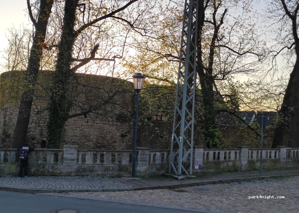 Der Platz ist im wunderschöner, kleiner Ort Schkölen, direkt an der Wasserburg, fester, beleuchteter Sandplatz, auf dem geparkt wird.